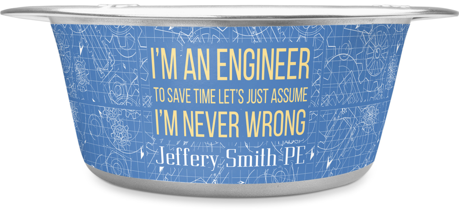 The main focus of this design is a funny quote that says "I'm an engineer, to save time let's just assume I'm never wrong." This will be sure to get anyone to crack a smile. The background is a blueprint pattern with gears and other shapes. The main colors are blue and light yellow. Your personalization goes directly under the quote.