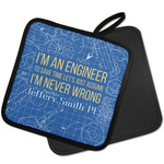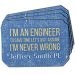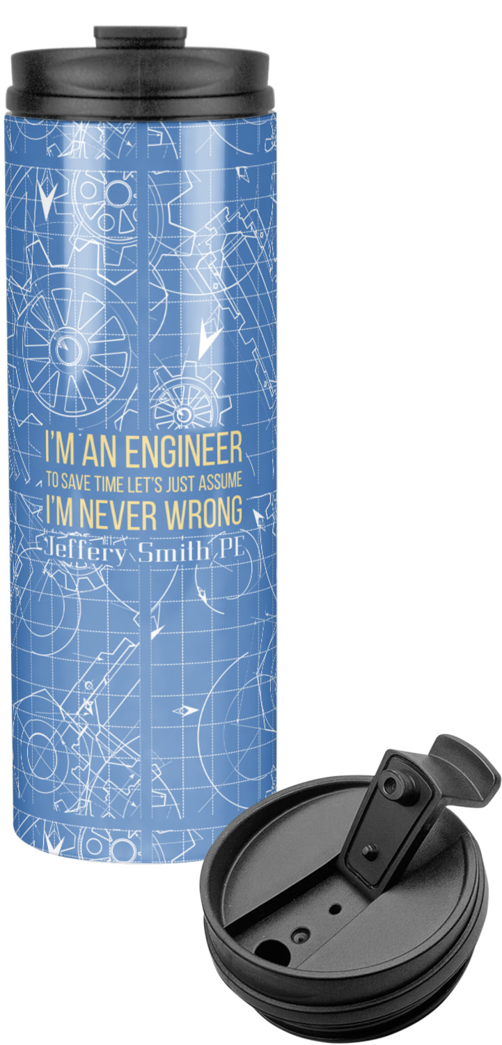 The main focus of this design is a funny quote that says "I'm an engineer, to save time let's just assume I'm never wrong." This will be sure to get anyone to crack a smile. The background is a blueprint pattern with gears and other shapes. The main colors are blue and light yellow. Your personalization goes directly under the quote.