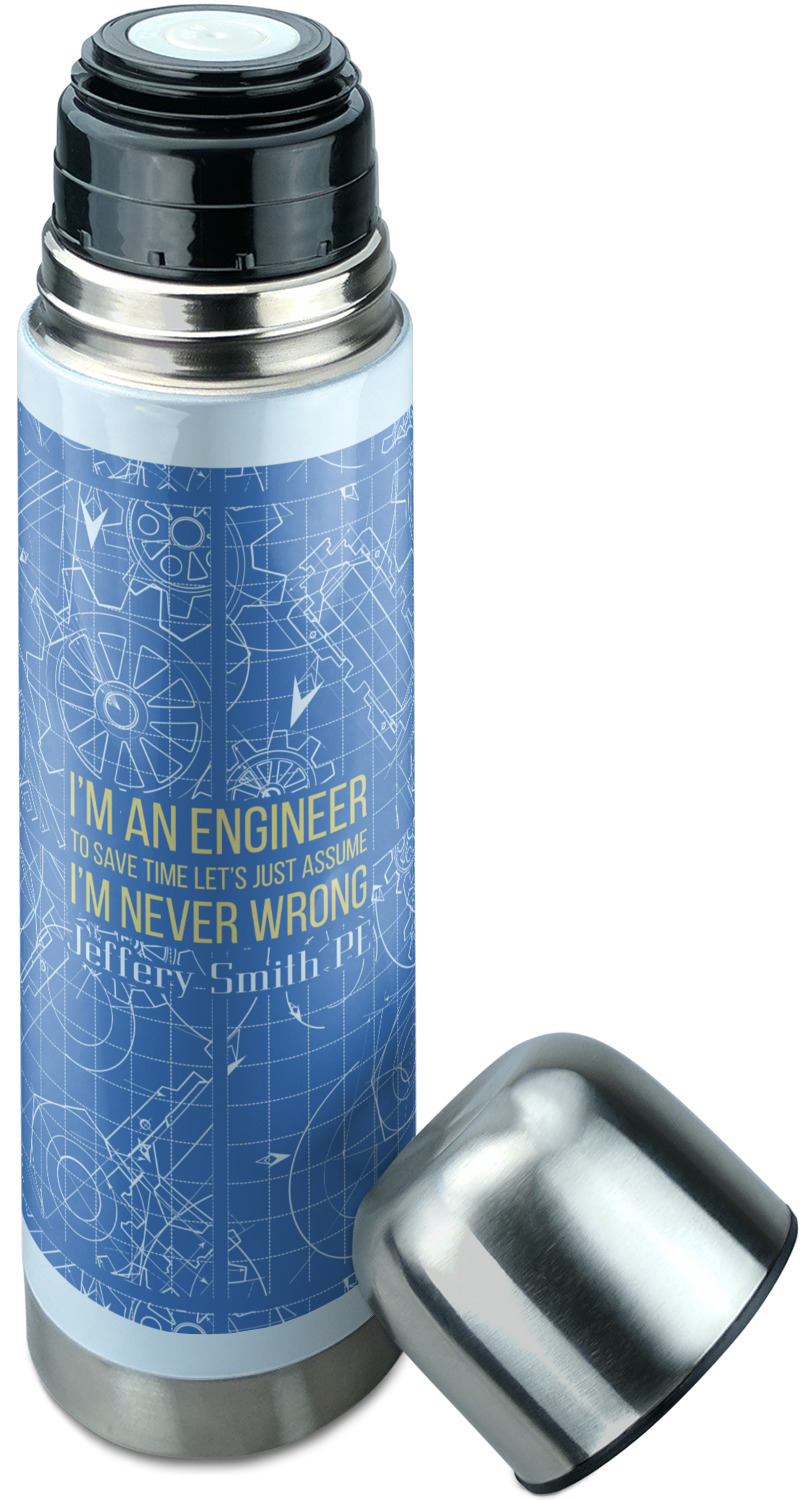 Manufactured from stainless steel, this thermos is built durably and double-walled insulated to preserve the temperature of your drink for hours. It also features a screw off lid that is made to also function as a small cup. Upon unscrewing this part of the thermos bottle, a pop-open, pour feature emerges. This feature allows you to slowly pour your beverage into your lid, ensuring a steady, controlled pour into your lid or other cup. With a capacity of 25 ounces, these large thermoses can hold several servings of your favorite beverage. Your customization is displayed all around the bottle with bright, vibrant color.
