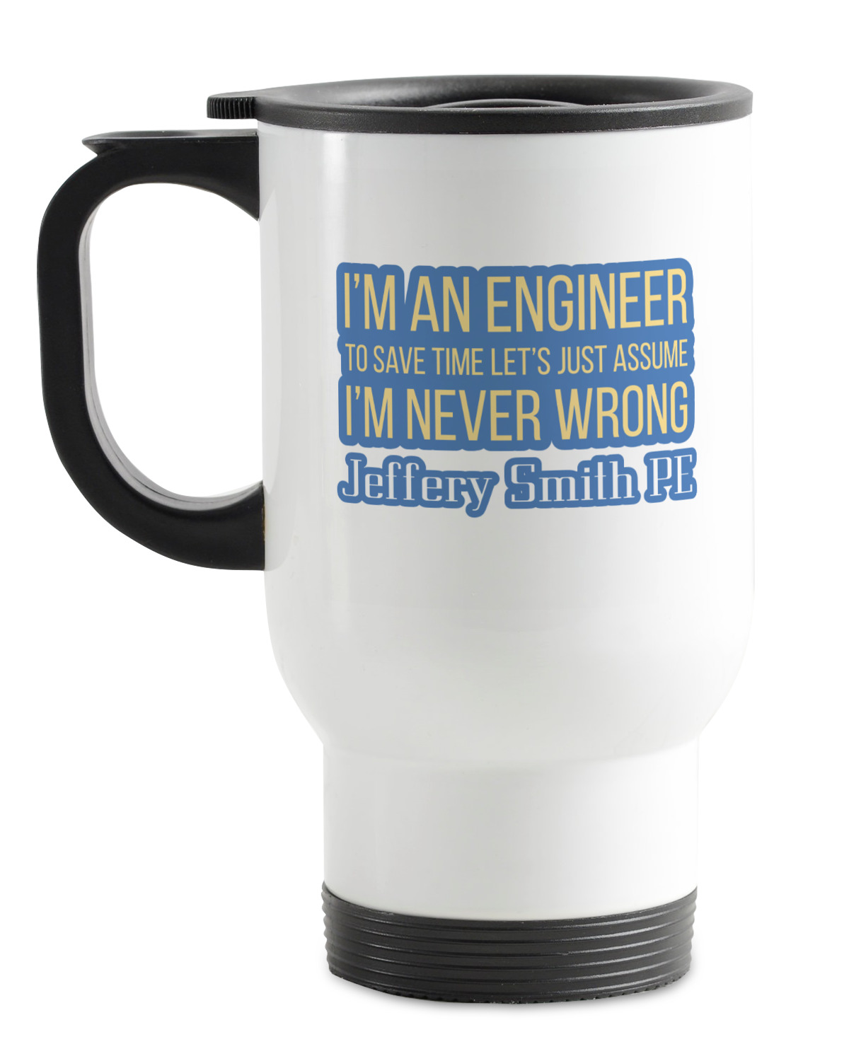 The main focus of this design is a funny quote that says "I'm an engineer, to save time let's just assume I'm never wrong." This will be sure to get anyone to crack a smile. The background is a blueprint pattern with gears and other shapes. The main colors are blue and light yellow. Your personalization goes directly under the quote.