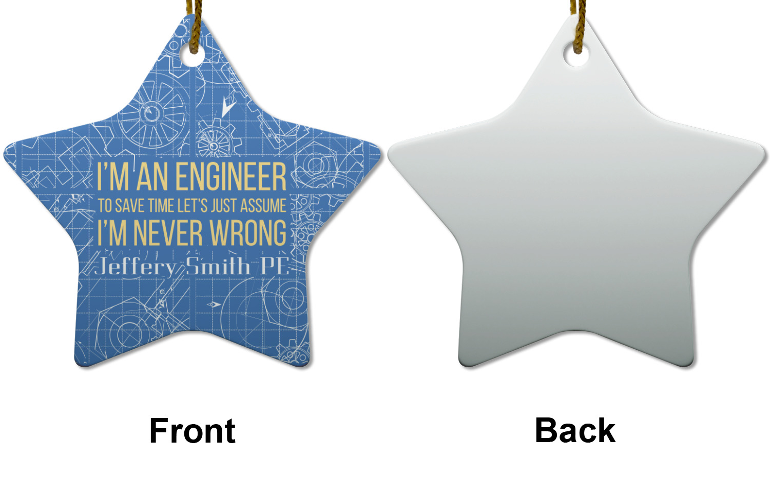 The main focus of this design is a funny quote that says "I'm an engineer, to save time let's just assume I'm never wrong." This will be sure to get anyone to crack a smile. The background is a blueprint pattern with gears and other shapes. The main colors are blue and light yellow. Your personalization goes directly under the quote.