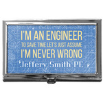 The main focus of this design is a funny quote that says "I'm an engineer, to save time let's just assume I'm never wrong." This will be sure to get anyone to crack a smile. The background is a blueprint pattern with gears and other shapes. The main colors are blue and light yellow. Your personalization goes directly under the quote.