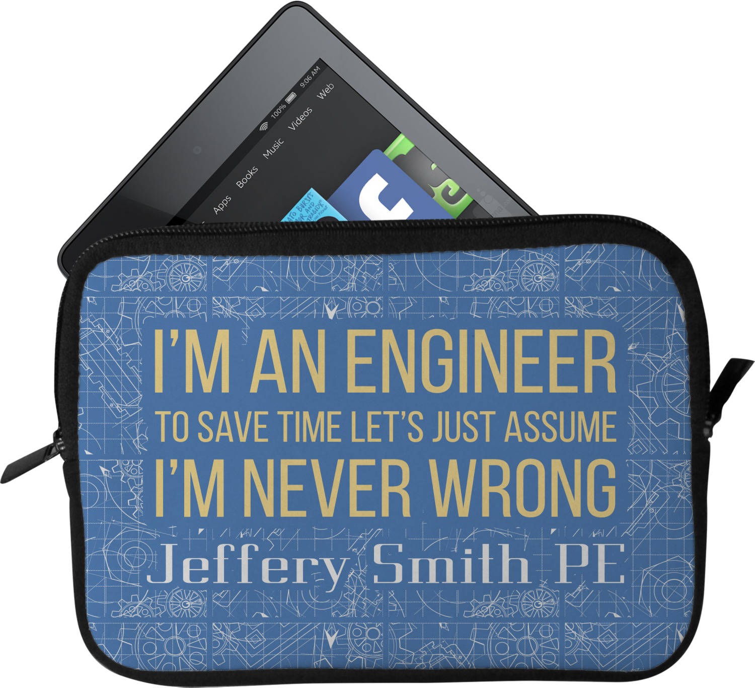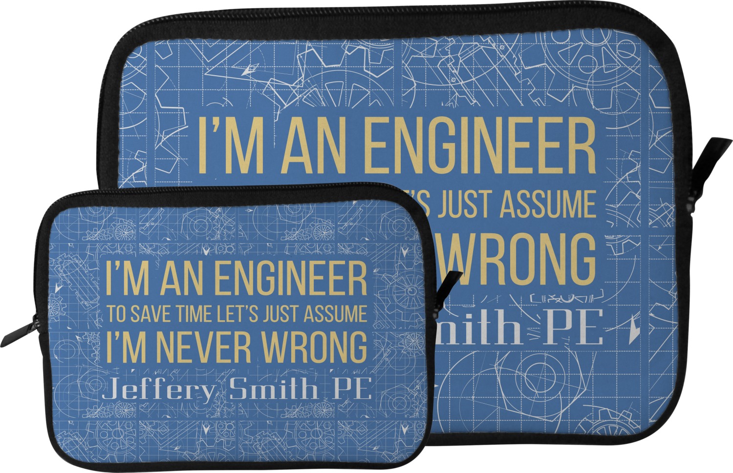 The main focus of this design is a funny quote that says "I'm an engineer, to save time let's just assume I'm never wrong." This will be sure to get anyone to crack a smile. The background is a blueprint pattern with gears and other shapes. The main colors are blue and light yellow. Your personalization goes directly under the quote.