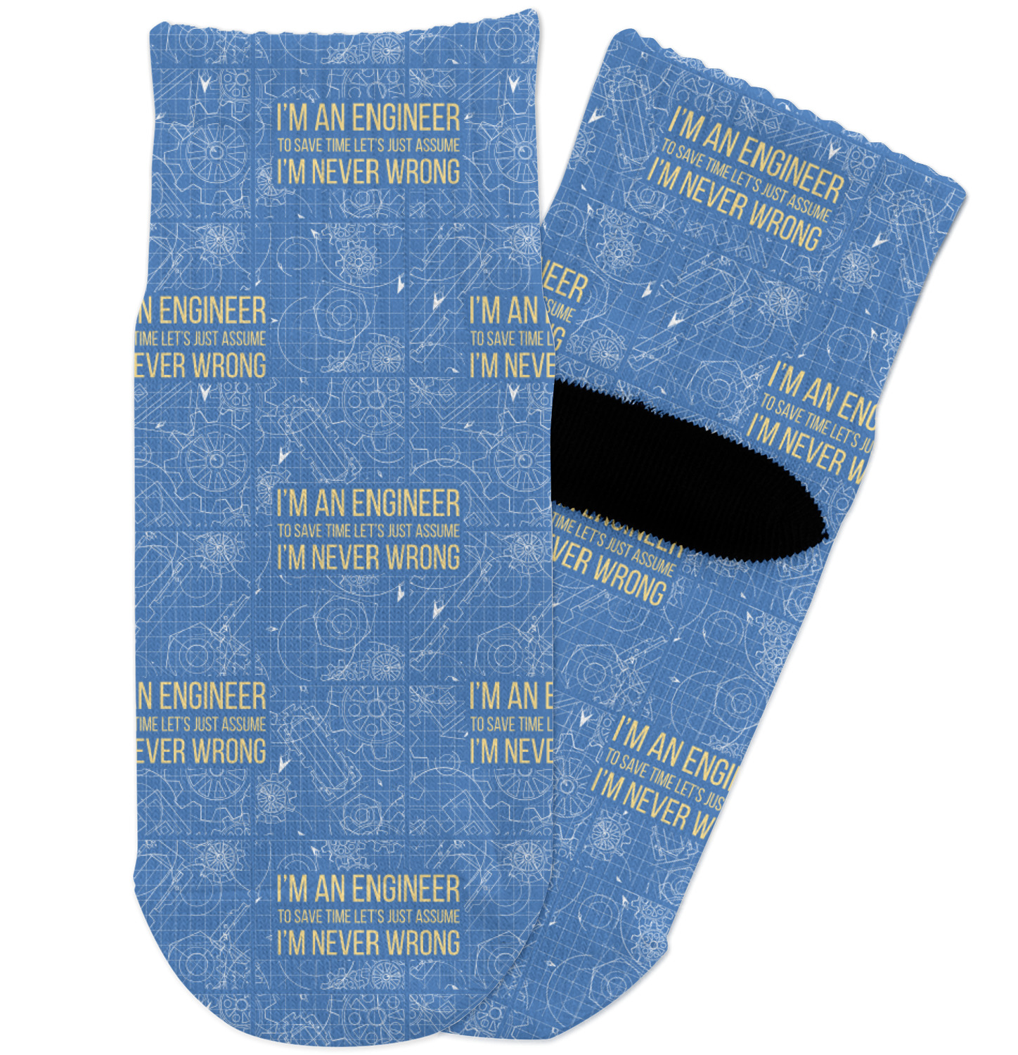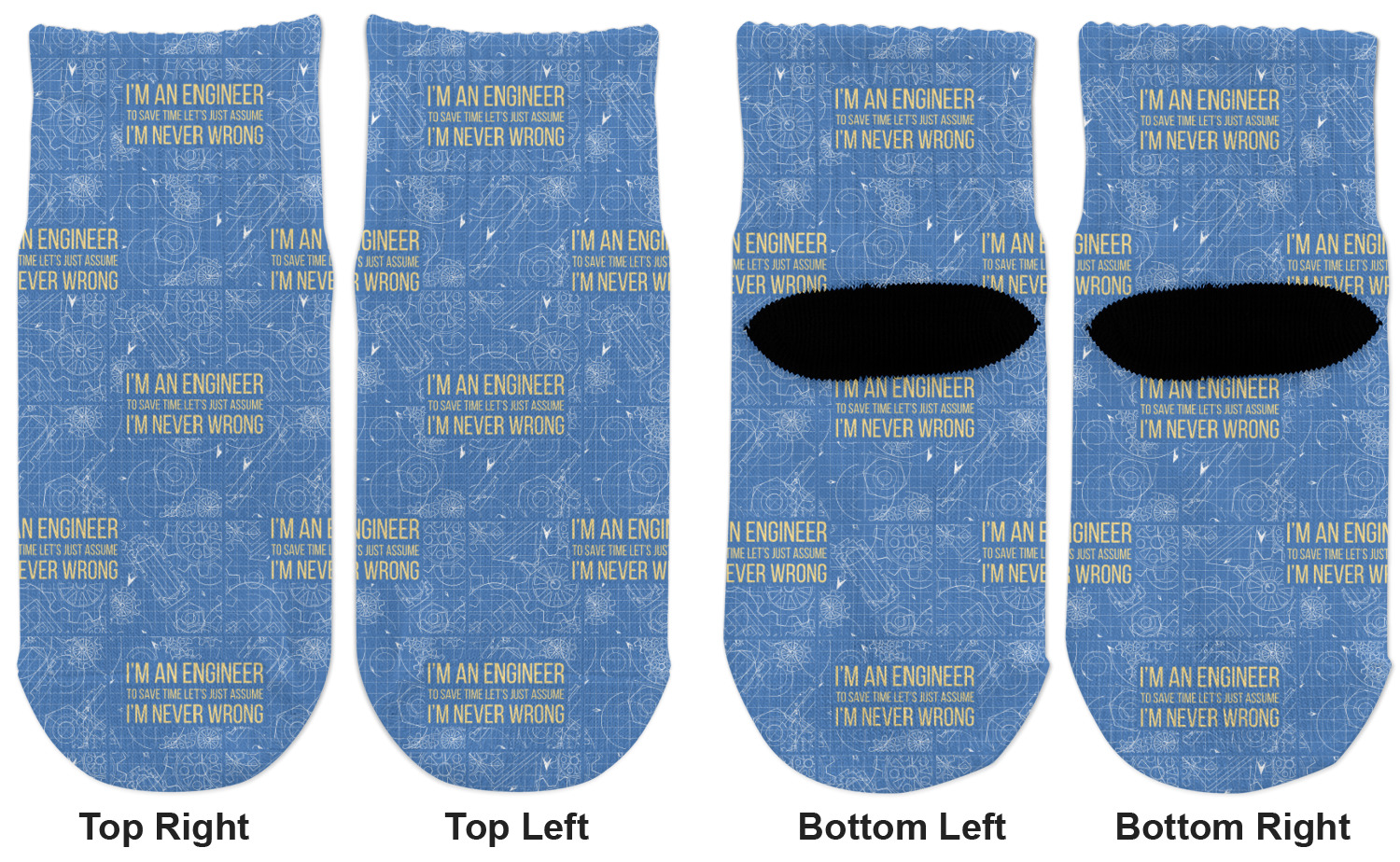 The main focus of this design is a funny quote that says "I'm an engineer, to save time let's just assume I'm never wrong." This will be sure to get anyone to crack a smile. The background is a blueprint pattern with gears and other shapes. The main colors are blue and light yellow. Your personalization goes directly under the quote.