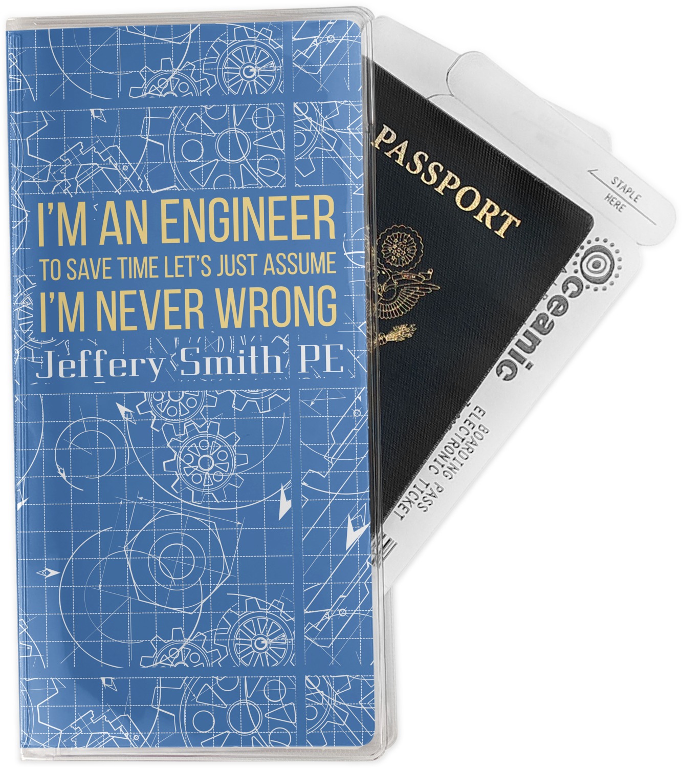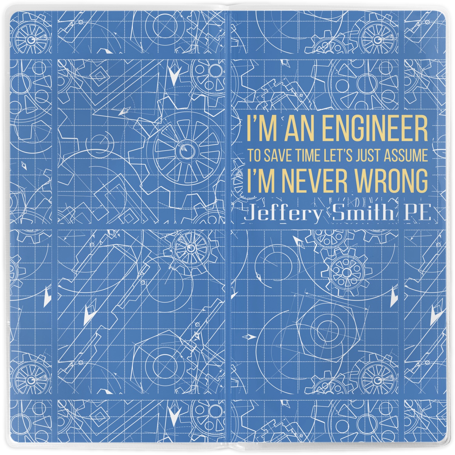 The main focus of this design is a funny quote that says "I'm an engineer, to save time let's just assume I'm never wrong." This will be sure to get anyone to crack a smile. The background is a blueprint pattern with gears and other shapes. The main colors are blue and light yellow. Your personalization goes directly under the quote.