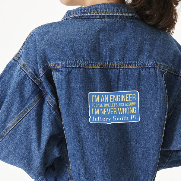 The main focus of this design is a funny quote that says "I'm an engineer, to save time let's just assume I'm never wrong." This will be sure to get anyone to crack a smile. The background is a blueprint pattern with gears and other shapes. The main colors are blue and light yellow. Your personalization goes directly under the quote.