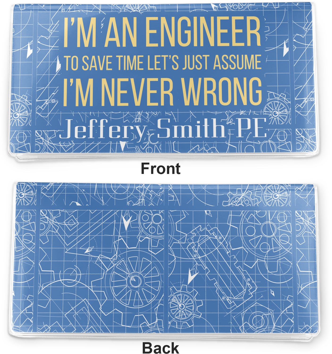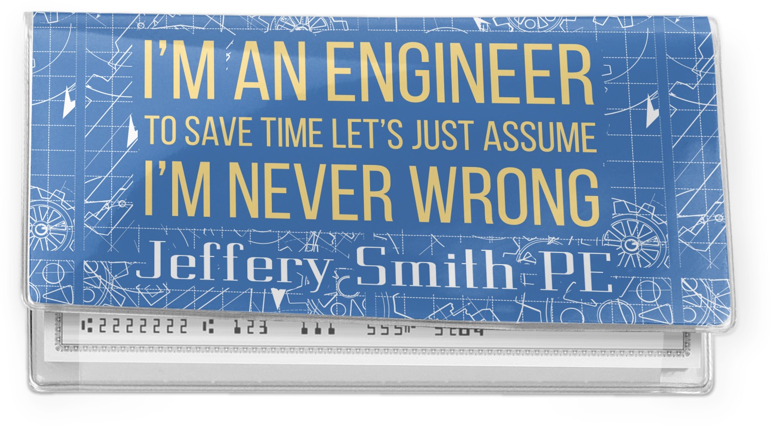 The main focus of this design is a funny quote that says "I'm an engineer, to save time let's just assume I'm never wrong." This will be sure to get anyone to crack a smile. The background is a blueprint pattern with gears and other shapes. The main colors are blue and light yellow. Your personalization goes directly under the quote.