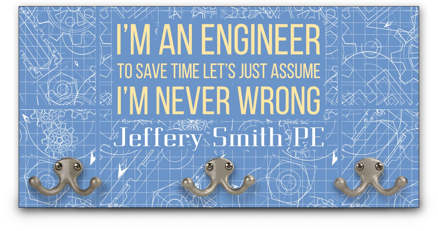 The main focus of this design is a funny quote that says "I'm an engineer, to save time let's just assume I'm never wrong." This will be sure to get anyone to crack a smile. The background is a blueprint pattern with gears and other shapes. The main colors are blue and light yellow. Your personalization goes directly under the quote.