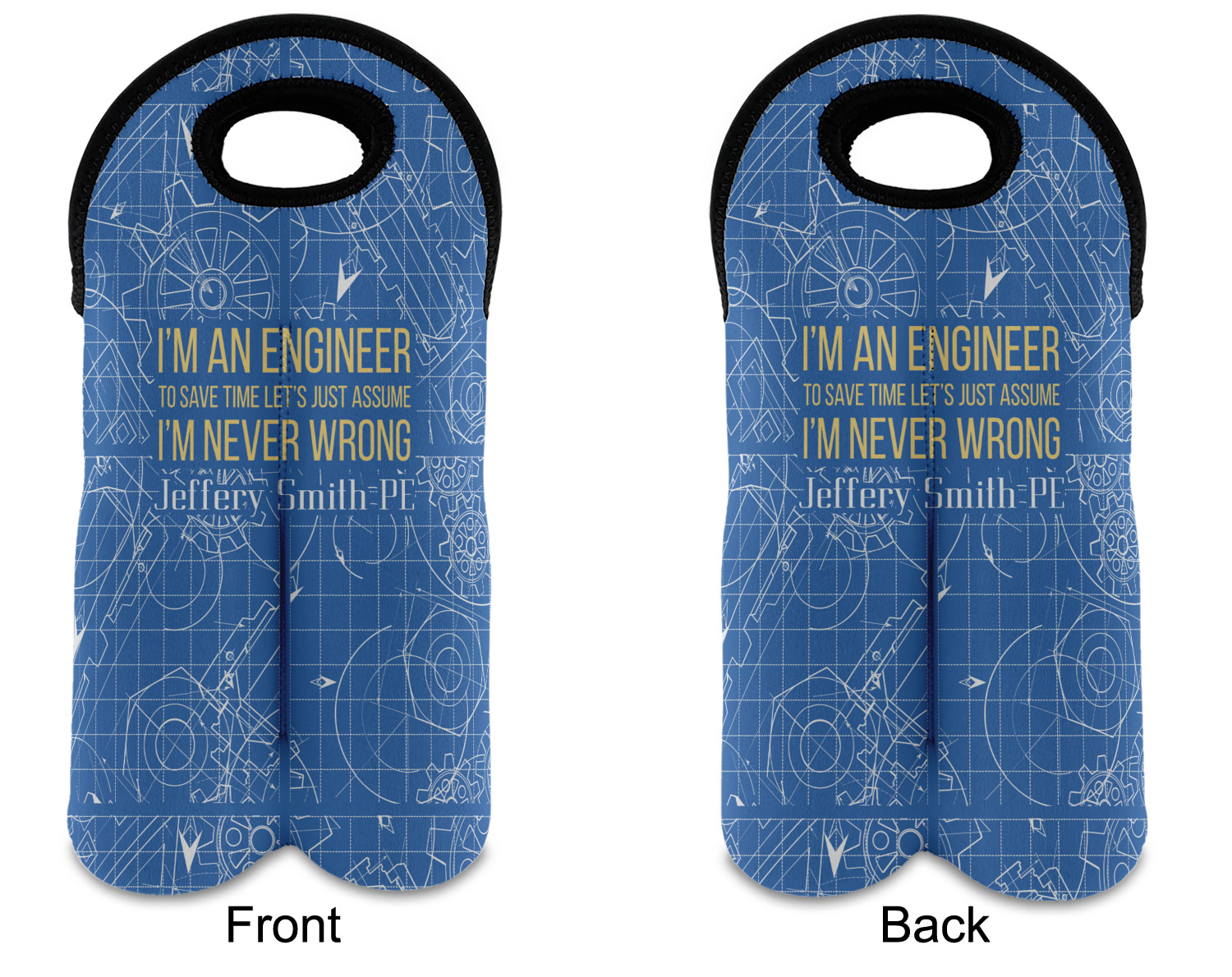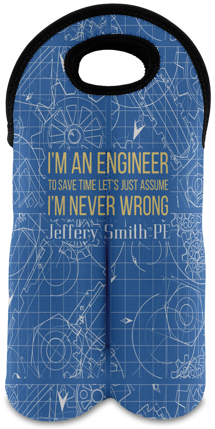 The main focus of this design is a funny quote that says "I'm an engineer, to save time let's just assume I'm never wrong." This will be sure to get anyone to crack a smile. The background is a blueprint pattern with gears and other shapes. The main colors are blue and light yellow. Your personalization goes directly under the quote.