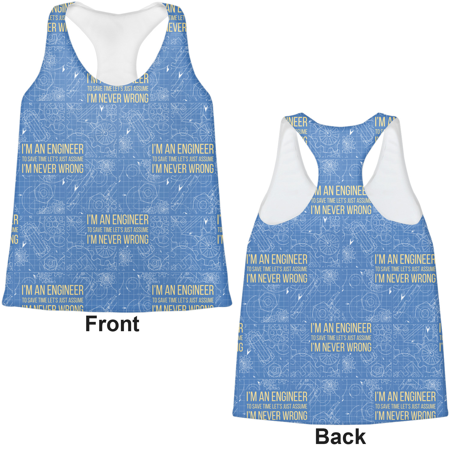 The main focus of this design is a funny quote that says "I'm an engineer, to save time let's just assume I'm never wrong." This will be sure to get anyone to crack a smile. The background is a blueprint pattern with gears and other shapes. The main colors are blue and light yellow. Your personalization goes directly under the quote.