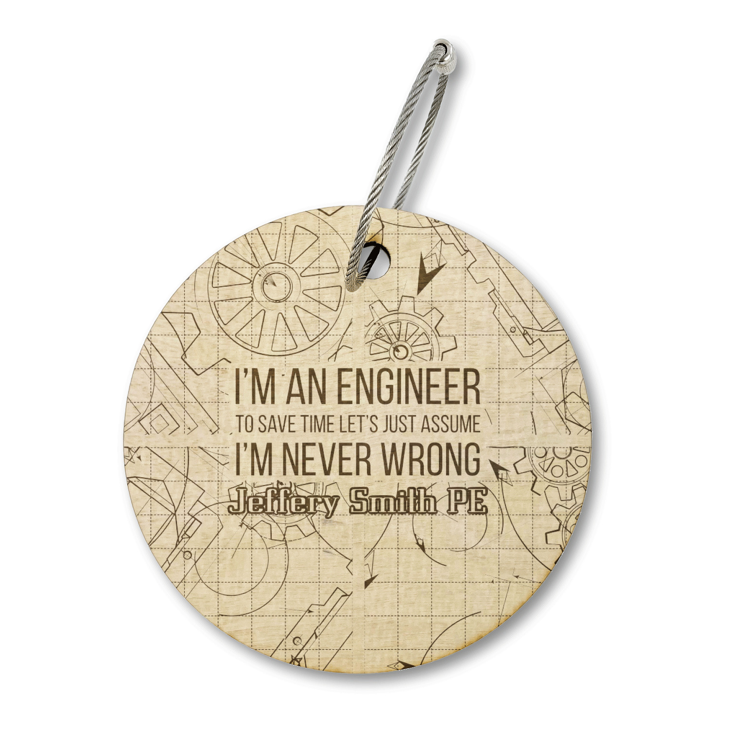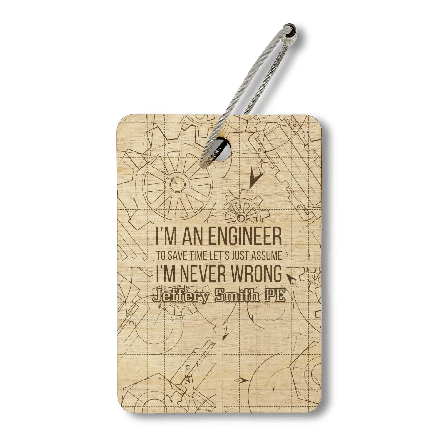 The main focus of this design is a funny quote that says "I'm an engineer, to save time let's just assume I'm never wrong." This will be sure to get anyone to crack a smile. The background is a blueprint pattern with gears and other shapes. The main colors are blue and light yellow. Your personalization goes directly under the quote.