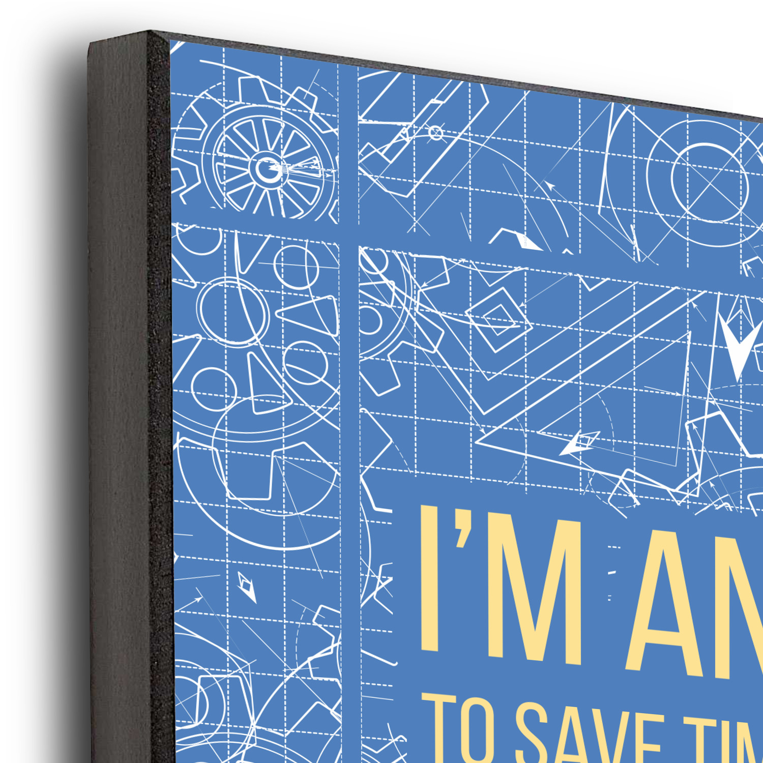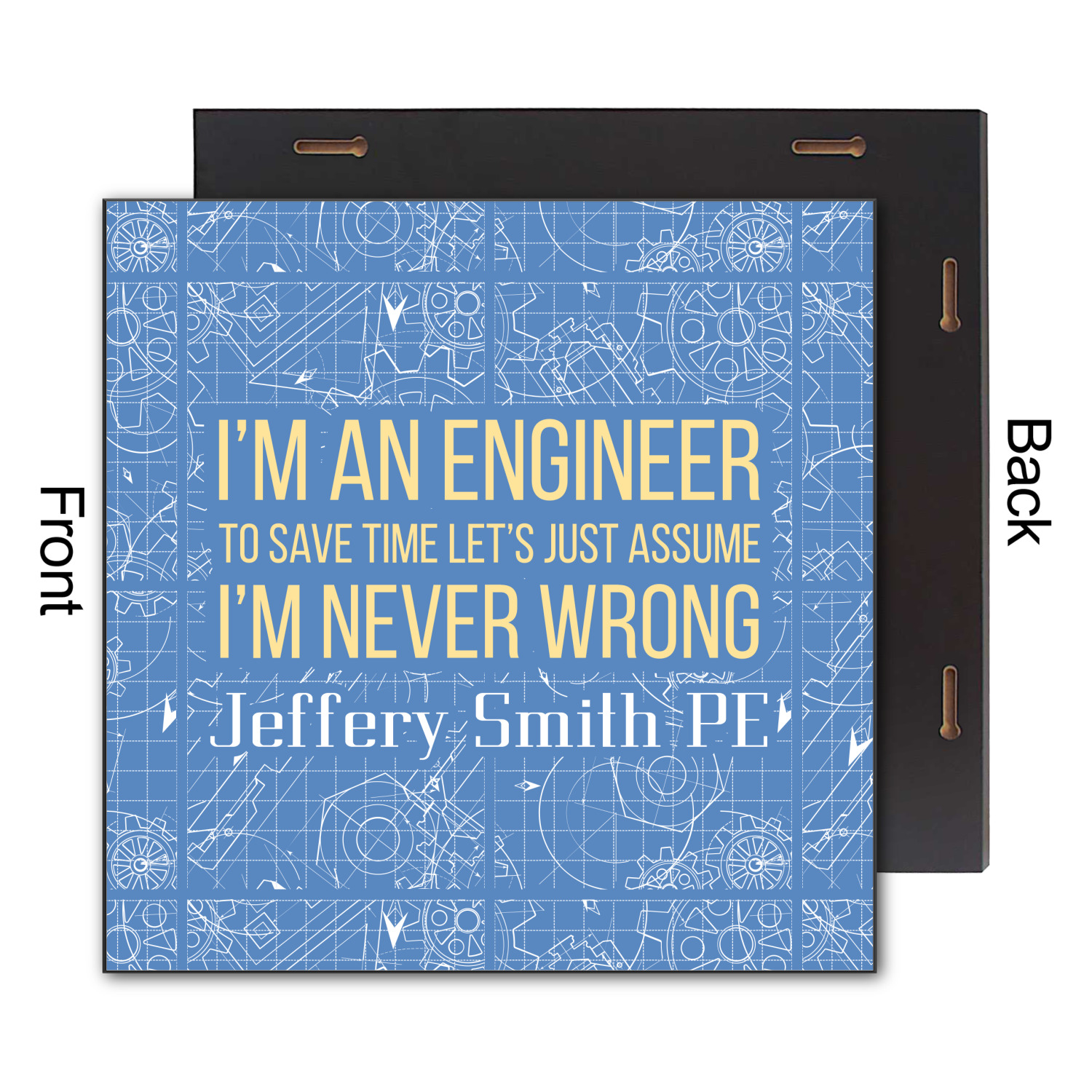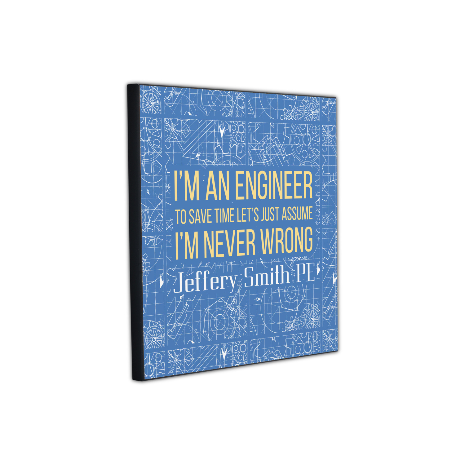The main focus of this design is a funny quote that says "I'm an engineer, to save time let's just assume I'm never wrong." This will be sure to get anyone to crack a smile. The background is a blueprint pattern with gears and other shapes. The main colors are blue and light yellow. Your personalization goes directly under the quote.