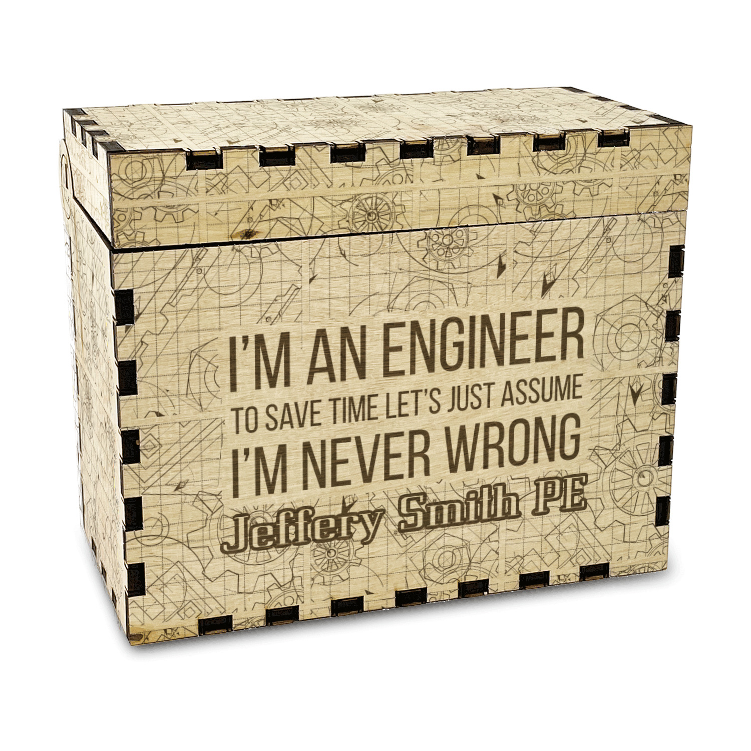 The main focus of this design is a funny quote that says "I'm an engineer, to save time let's just assume I'm never wrong." This will be sure to get anyone to crack a smile. The background is a blueprint pattern with gears and other shapes. The main colors are blue and light yellow. Your personalization goes directly under the quote.