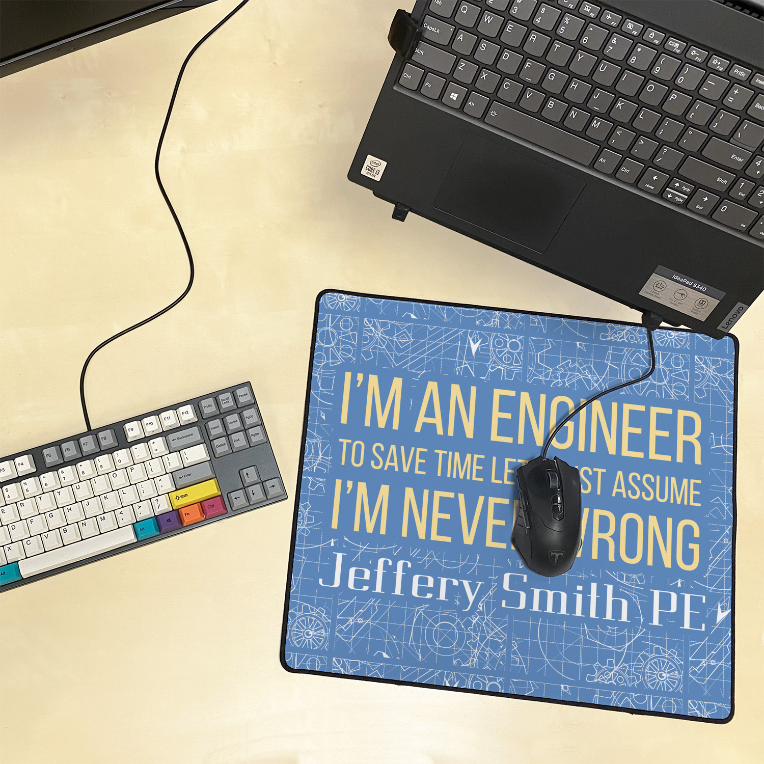 The main focus of this design is a funny quote that says "I'm an engineer, to save time let's just assume I'm never wrong." This will be sure to get anyone to crack a smile. The background is a blueprint pattern with gears and other shapes. The main colors are blue and light yellow. Your personalization goes directly under the quote.