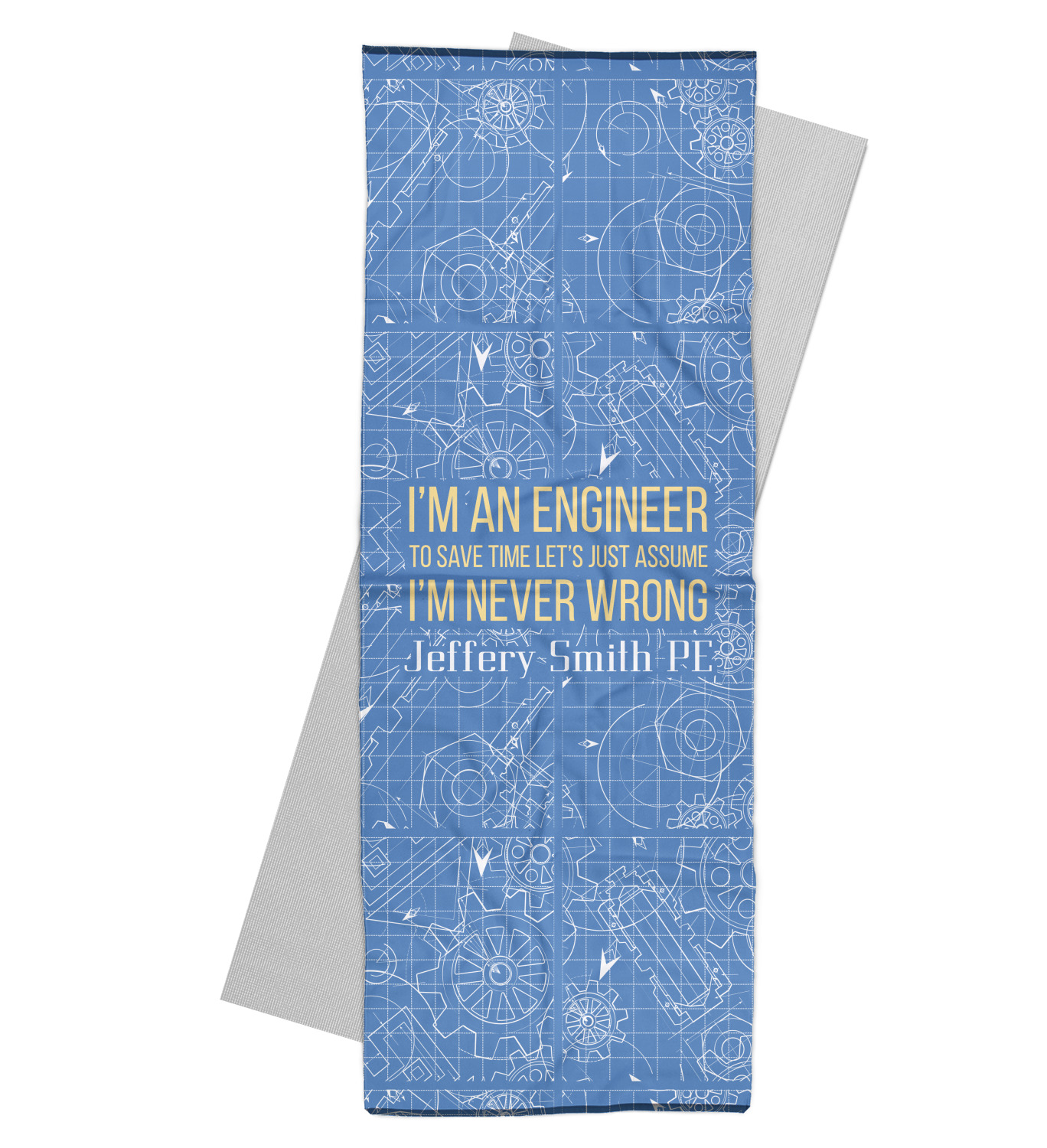 The main focus of this design is a funny quote that says "I'm an engineer, to save time let's just assume I'm never wrong." This will be sure to get anyone to crack a smile. The background is a blueprint pattern with gears and other shapes. The main colors are blue and light yellow. Your personalization goes directly under the quote.