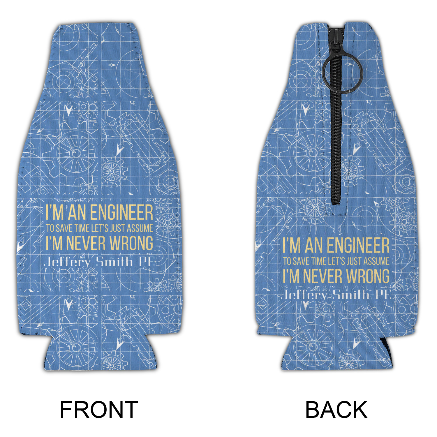 The main focus of this design is a funny quote that says "I'm an engineer, to save time let's just assume I'm never wrong." This will be sure to get anyone to crack a smile. The background is a blueprint pattern with gears and other shapes. The main colors are blue and light yellow. Your personalization goes directly under the quote.