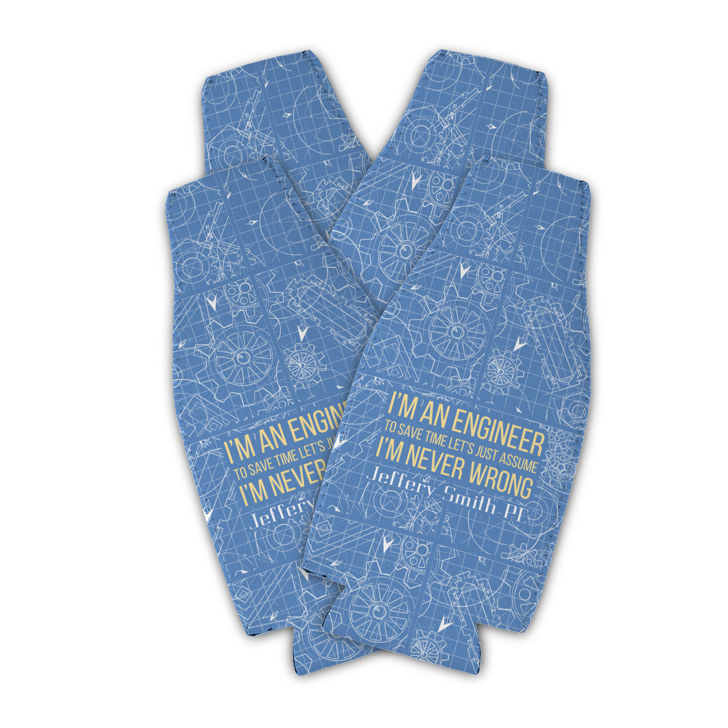 The main focus of this design is a funny quote that says "I'm an engineer, to save time let's just assume I'm never wrong." This will be sure to get anyone to crack a smile. The background is a blueprint pattern with gears and other shapes. The main colors are blue and light yellow. Your personalization goes directly under the quote.
