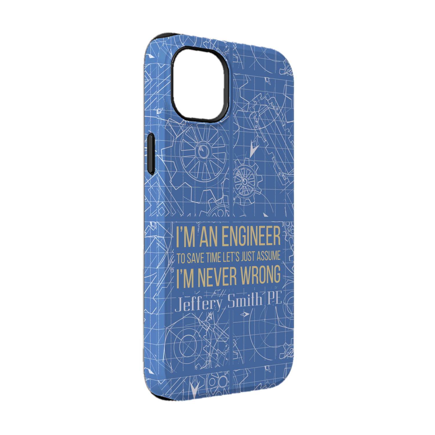 The main focus of this design is a funny quote that says "I'm an engineer, to save time let's just assume I'm never wrong." This will be sure to get anyone to crack a smile. The background is a blueprint pattern with gears and other shapes. The main colors are blue and light yellow. Your personalization goes directly under the quote.