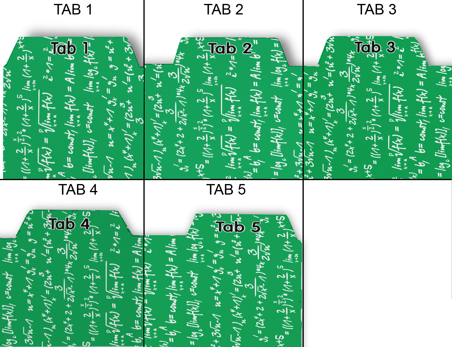 Whether you use binders at school or at work, we have designs to suit all of them. Available in 5 or 6 tab sets, you are sure to find a set to suit your needs. The back of each one is white and can be used to take notes, write vital information on, etc.