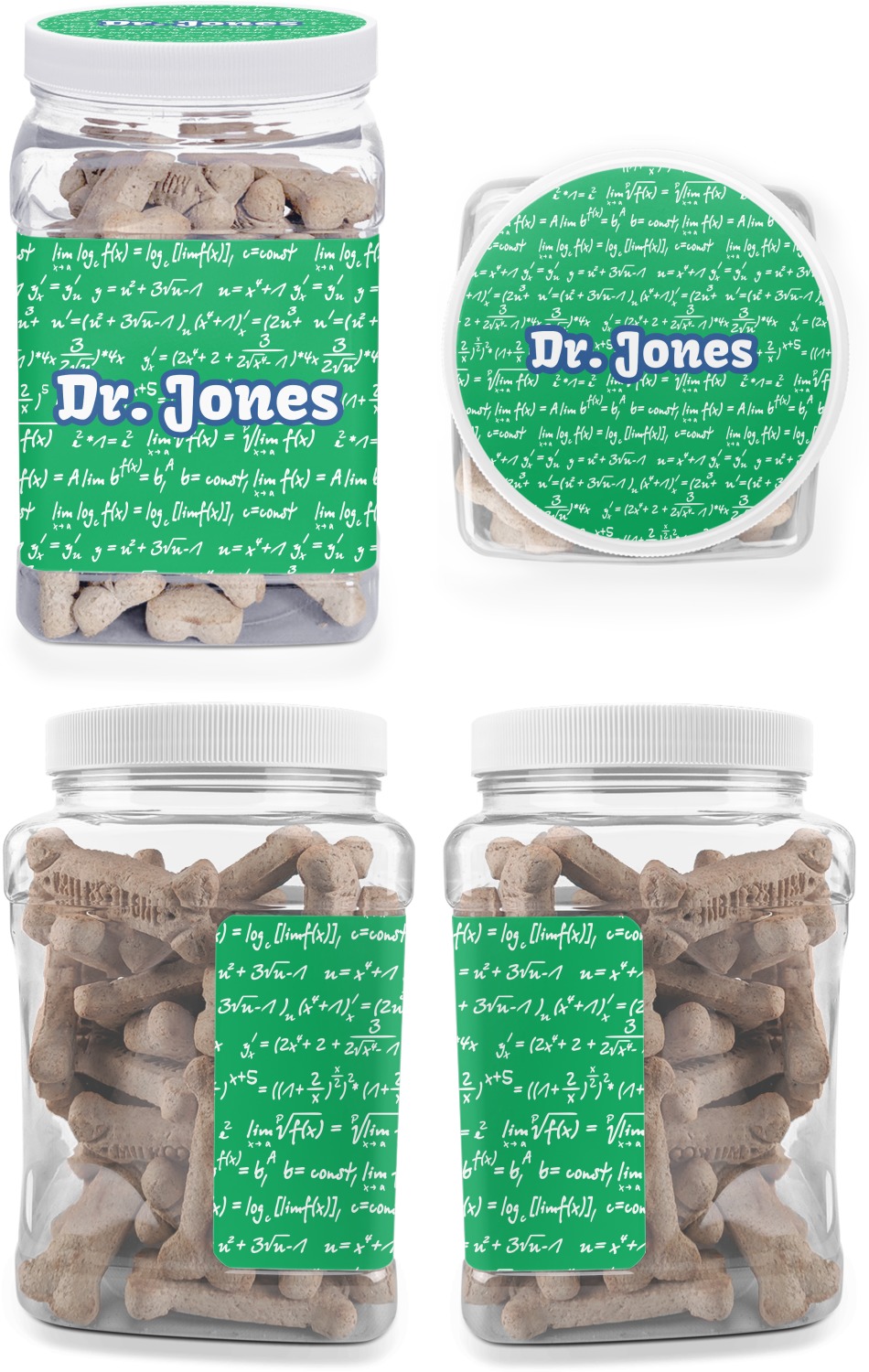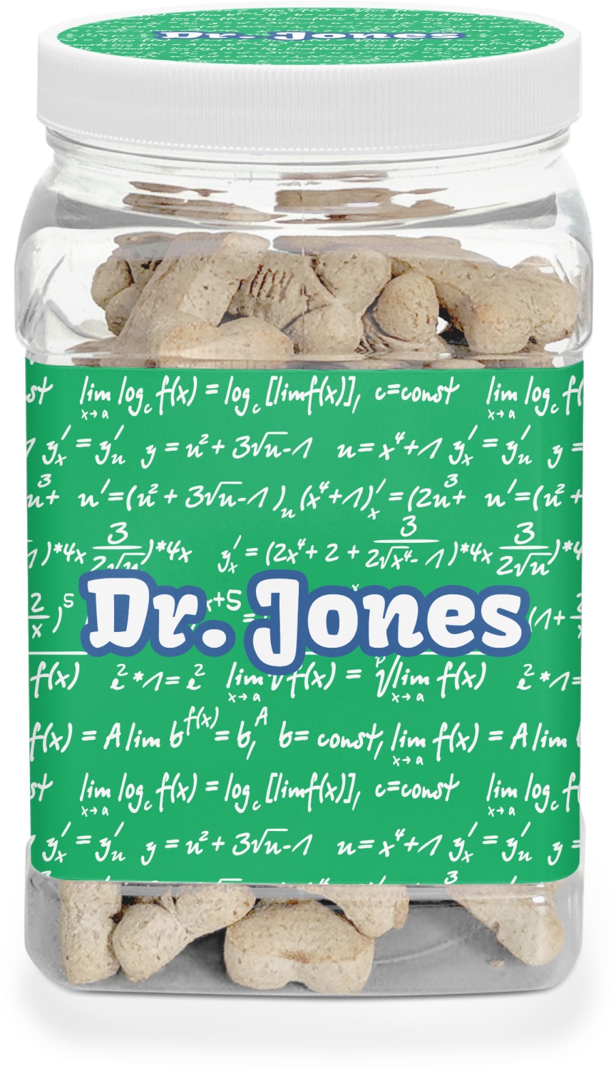 This half gallon jar, made from a sturdy plastic, is the perfect way to keep treats from any naughty pet paws, while still keeping them ready on hand for when your pup performs an impressive trick. This dog cookie jar features a screw-on, white lid that displays your personalized design on a vinyl sticker. We apply another customized sticker that wraps around the front and sides of the jar. Our dog treat jar also has indentations on the rear ends of the sides, which allows for convenient handling, and its square frame allows for easy storage.
