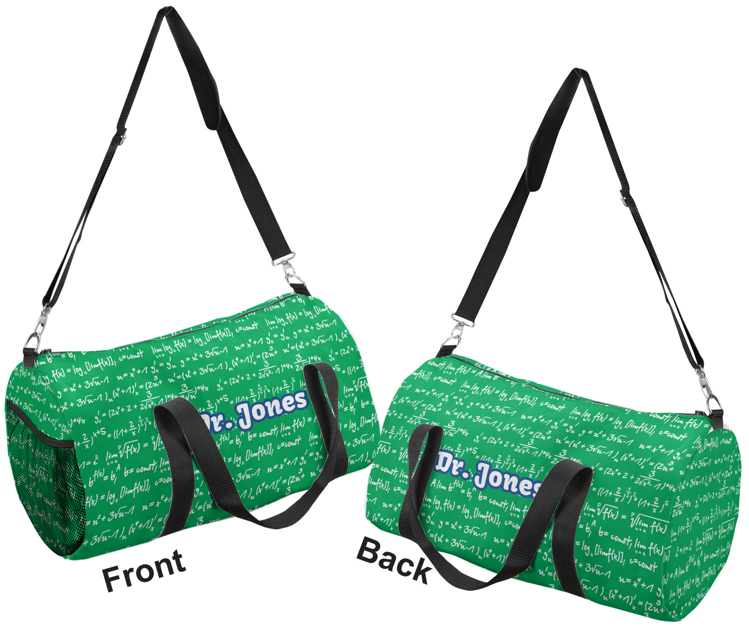 This duffle is a sturdy bag made of a canvas material. It comes in two sizes: Small (19"W x 9.5"H x 9.5"D) and Large (23"W x 12"H x 12"D). The bag is a cylindrical shape with a black adjustable strap and two handles. On one side is an elastic pouch to put a waterbottle or other small item. Your product will be sublimated with your design and is able to be designed on the front, back, and sides. Be sure to remember that the straps may cut into parts of your design if you upload your own artwork.