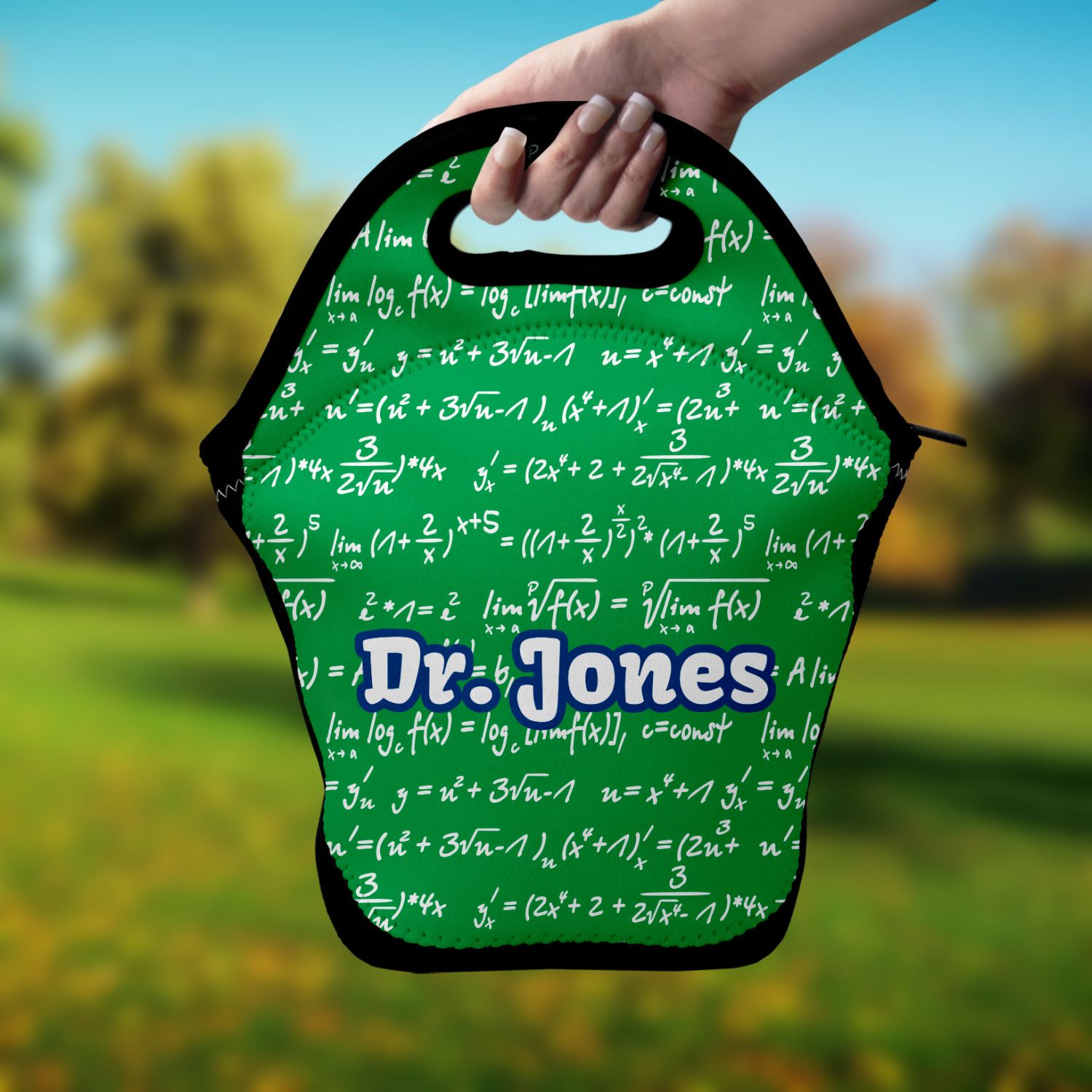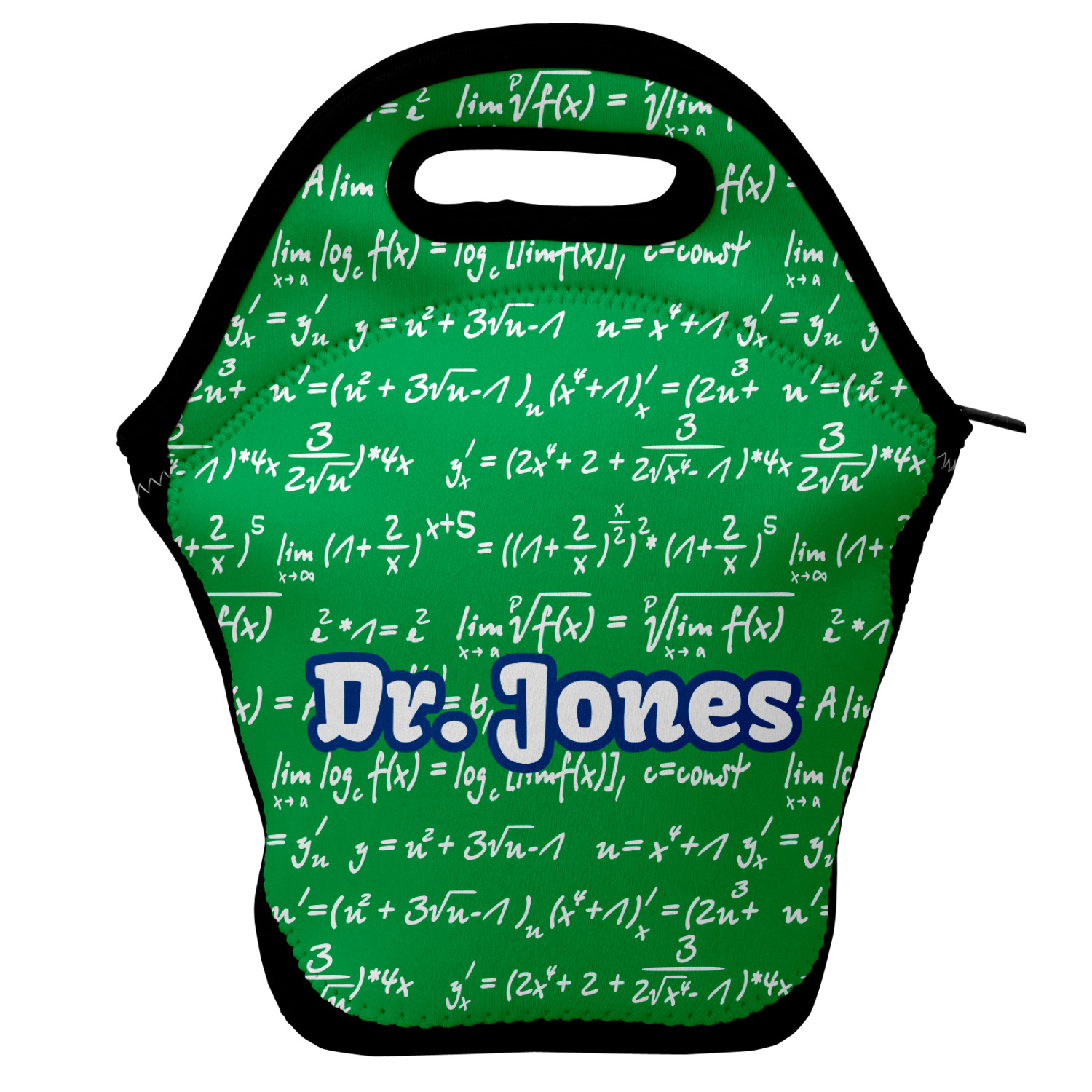 Our personalized lunch bags are made from a strong neoprene, and secure with a zipper closure that lines the top of the bag.The edges of the neoprene are sewn together with a heavy duty stitch, adding to the durability of the bag. The is accompanied by a reinforced handle at its top, for the easy transport of your lunch. We display your personalization across both the front and back of this neoprene lunch bag, while the remaining sides are a sleek black in color. Each bag measures at 13.5 inches tall, and 11.5 inches wide.