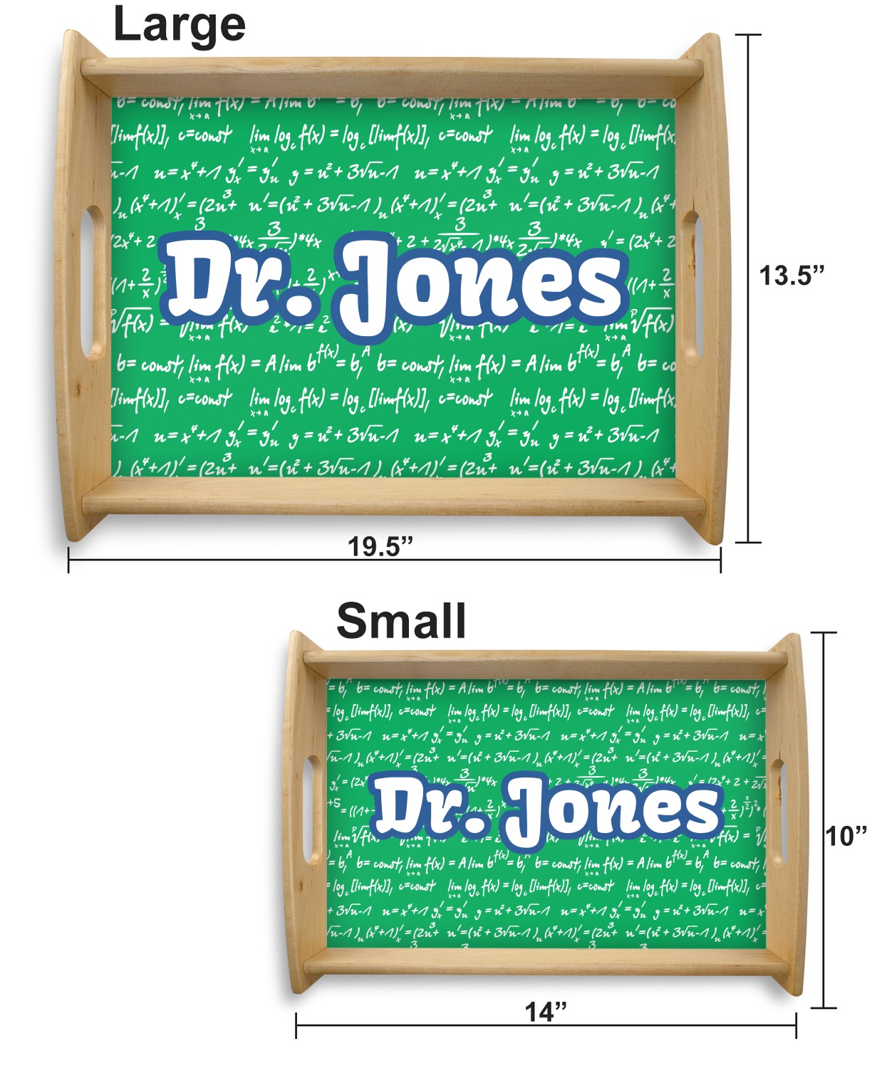 This serving tray with handles features square edges and two rounded sides, creating a very modern look. Each side is fabricated from a beautifully cut, natural wood. The bottom of the interior of the tray displays your customized design in bright, vibrant color. The tray is sold in both a black color and a natural wood look. Each variation of the wood serving tray has two sizes: Small, which is 14" x 10" x 2.25", and Large, which is 19.5" x 13.5" x 2.75".