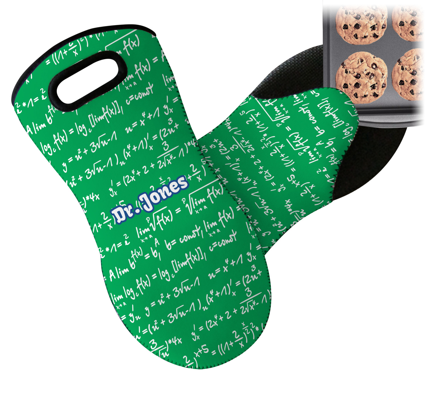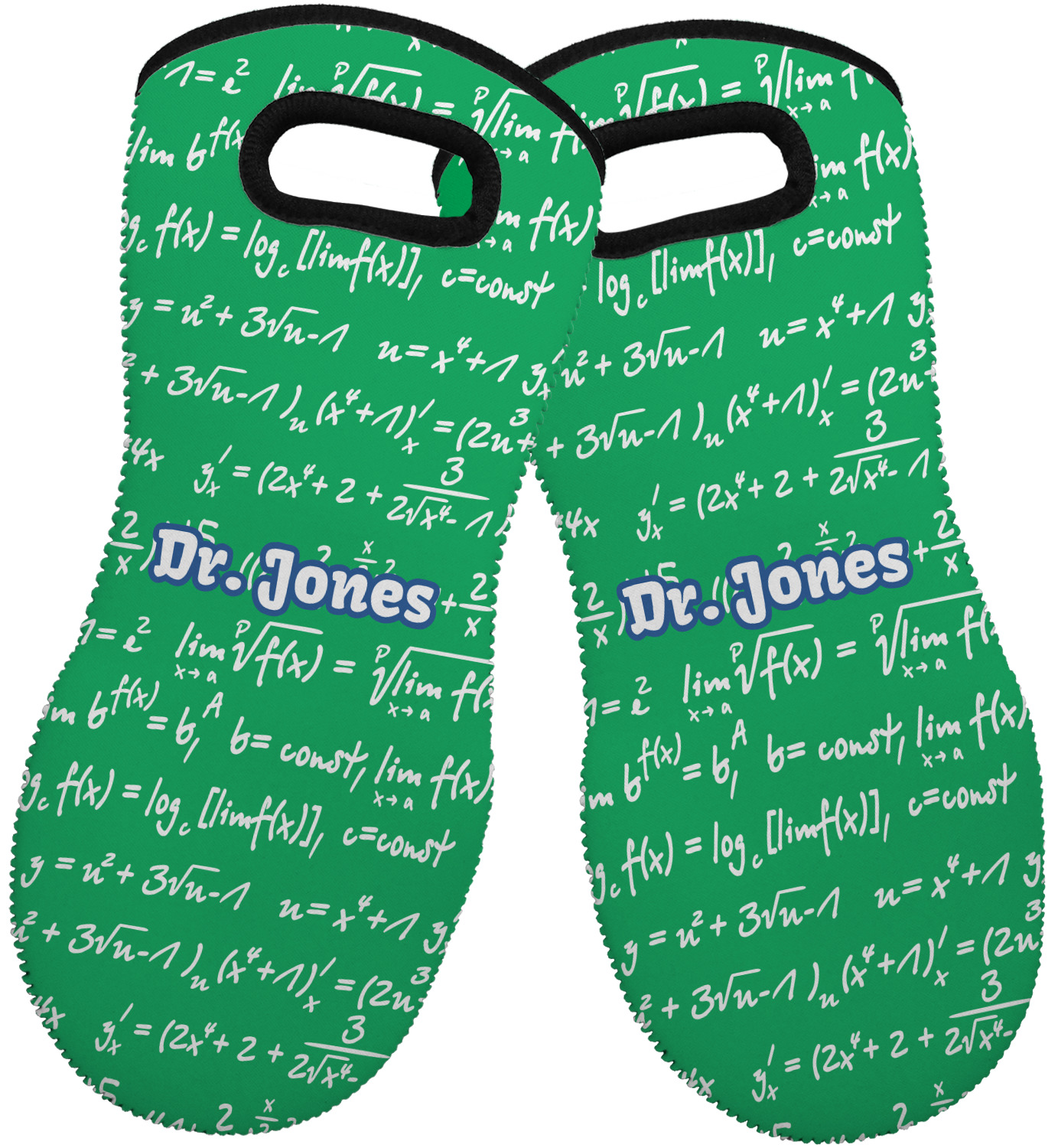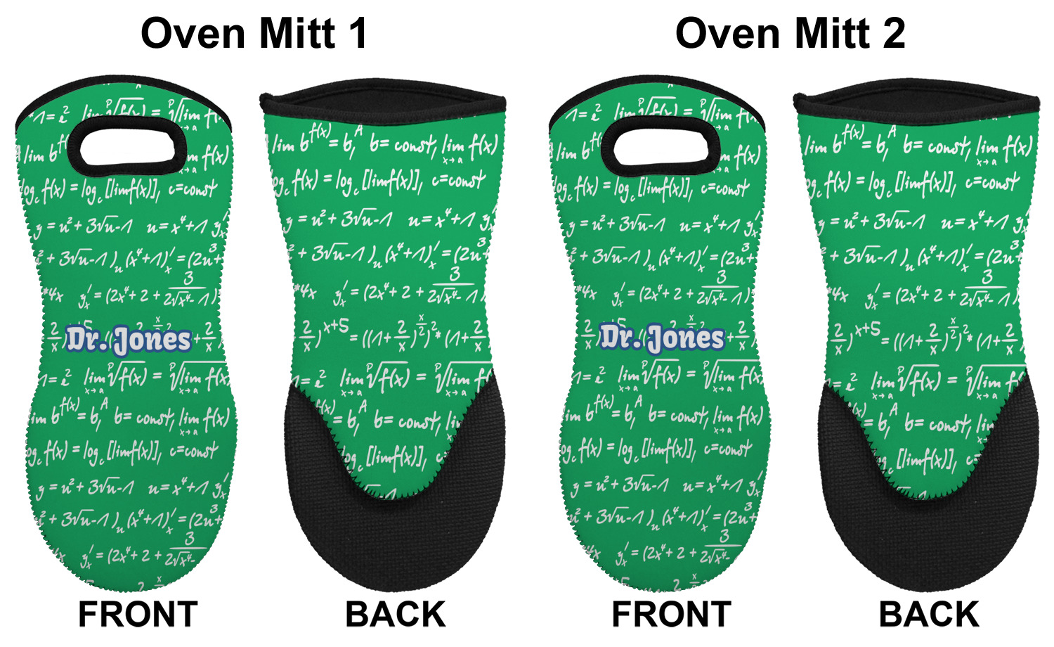 These heat resistant gloves are made entirely of a durable neoprene; the front features a softer texture, while the palm's side has a textured surface, meant to handle heat up to 500 degrees Fahrenheit. Thick, heavy duty stitching connects the two sides. A small, oval cutout appears on the front, and can be used to hang and store the mitt. Your personalization appears on the front, and the upper part of the back of the mitt. The style of these oven mitts are suitable for both the right and left hand, depending on your needs. If you need one for each hand, be sure to order two!