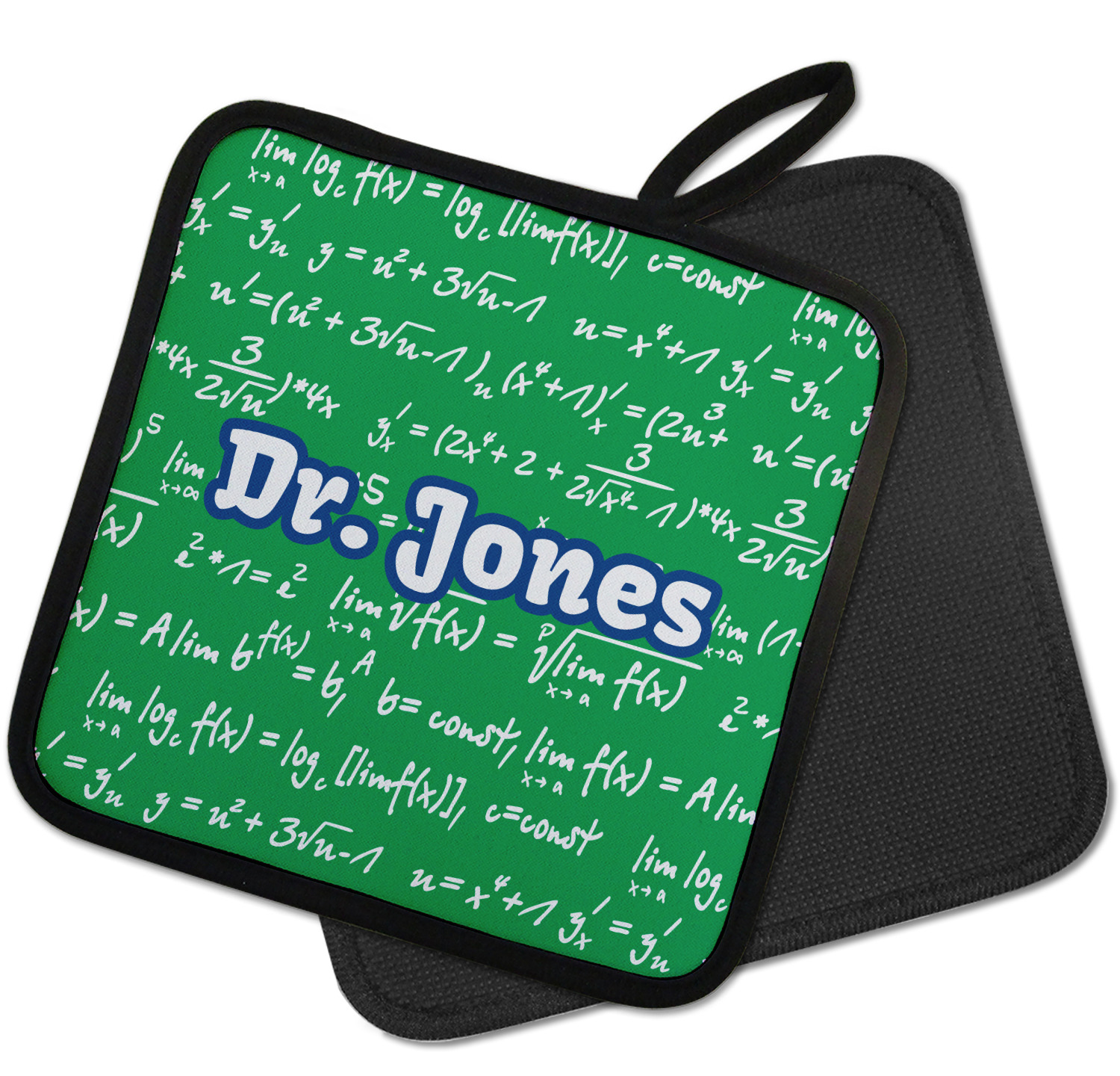 Our personalized pot holders feature a neoprene front that displays your personalization in vibrant colors. The backing of the hot pot holder is rubberized; the textured backing allows you to have a great grip when using this custom pot holder. The two materials are joined with a sleek, black trim, and the holder also includes an attached loop for hanging and storage. The pot holder is approximately 8.75 inches by 8.75 inches and 0.25 inches tall, while the fabric loop is 2.5 inches long. You can purchase a kitchen pot holder by itself or as a set of 2. We also offer a set including one pot holder and one oven mitt.