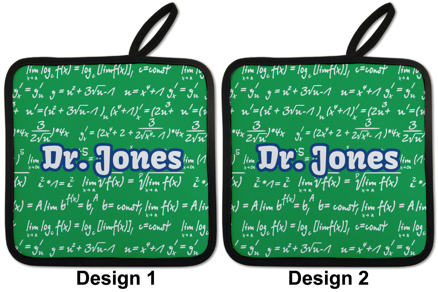 Our personalized pot holders feature a neoprene front that displays your personalization in vibrant colors. The backing of the hot pot holder is rubberized; the textured backing allows you to have a great grip when using this custom pot holder. The two materials are joined with a sleek, black trim, and the holder also includes an attached loop for hanging and storage. The pot holder is approximately 8.75 inches by 8.75 inches and 0.25 inches tall, while the fabric loop is 2.5 inches long. You can purchase a kitchen pot holder by itself or as a set of 2. We also offer a set including one pot holder and one oven mitt.