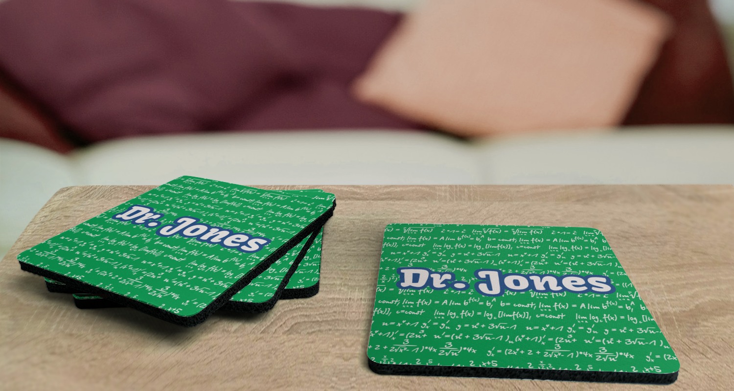 These drink coasters have a smooth, polyester top and a textured, rubber backing on its bottom. The non-slip rubber backing underneath works to keep any spills at bay. At 4 by 4 by 0.25 inches thick, these custom coasters are a suitable size for most drinkware. Your personalization is displayed atop the face of the cup coaster. We sell these rubber coasters in two different shapes: square and round. You can buy each shape as singulars or as a set of 4.