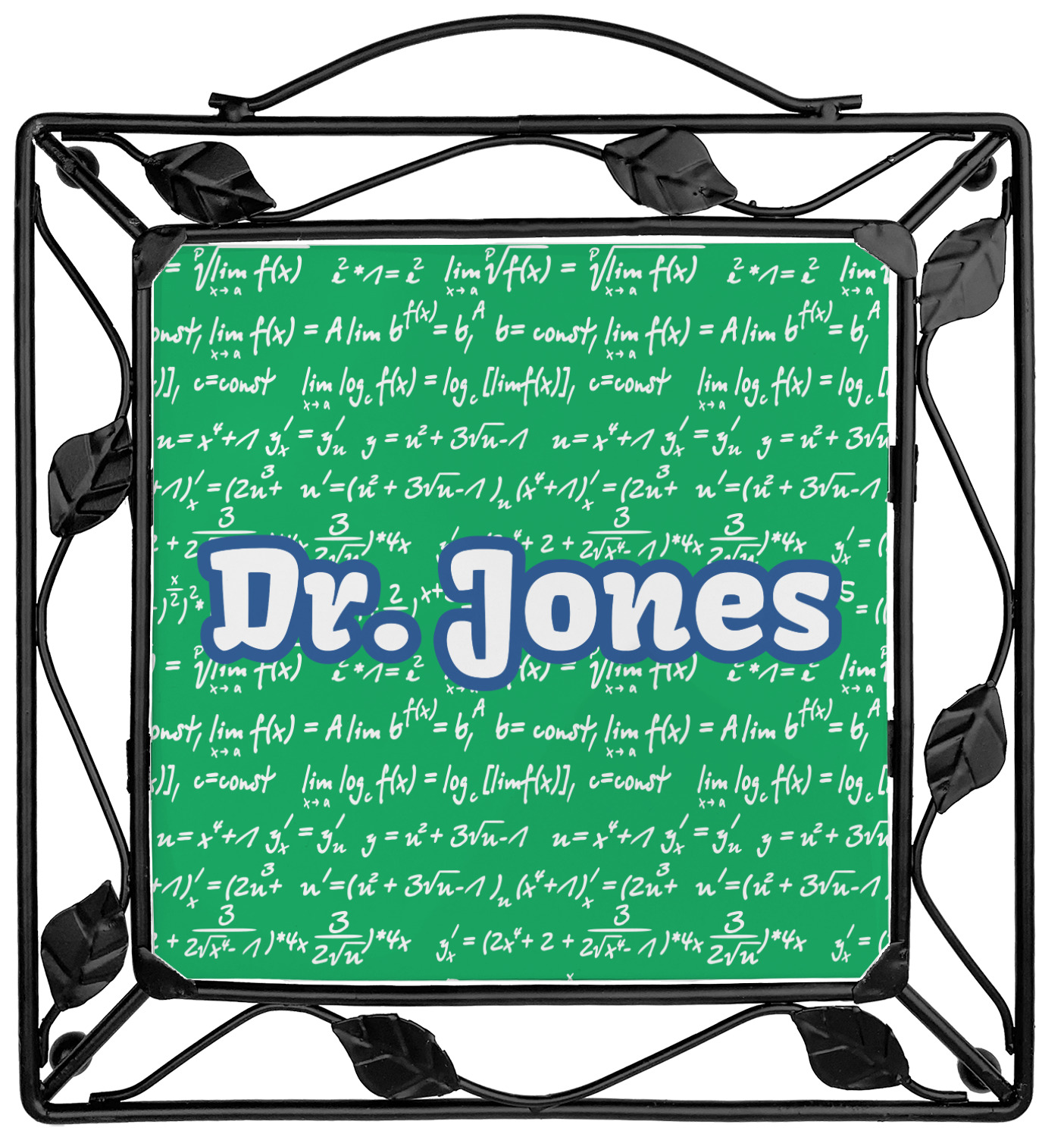 Our square trivets are made from a durable, wrought iron. This model features 4 small half circles, one on each corner, and a larger ring of iron that circles the central, customized tile. Each of the 4 corners has a round foot on its bottom for stability. This trivet is 8.75 by 8.75 inches, but the central tile measures at 6 inches on both sides.