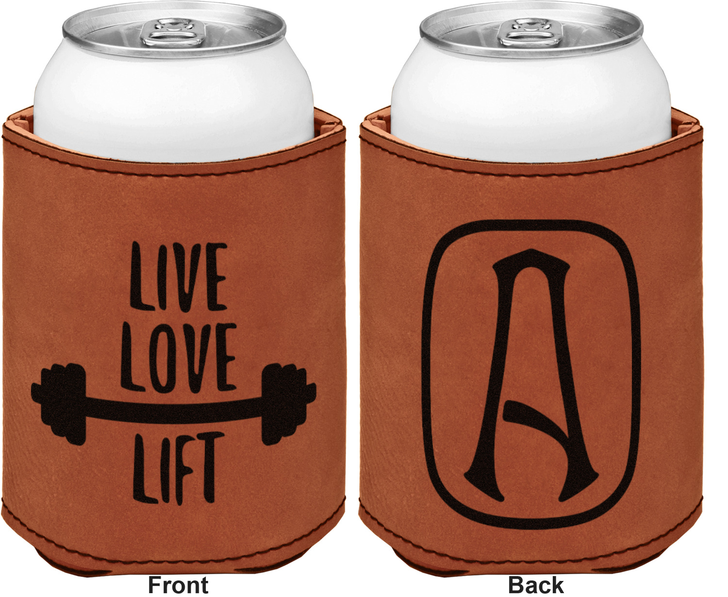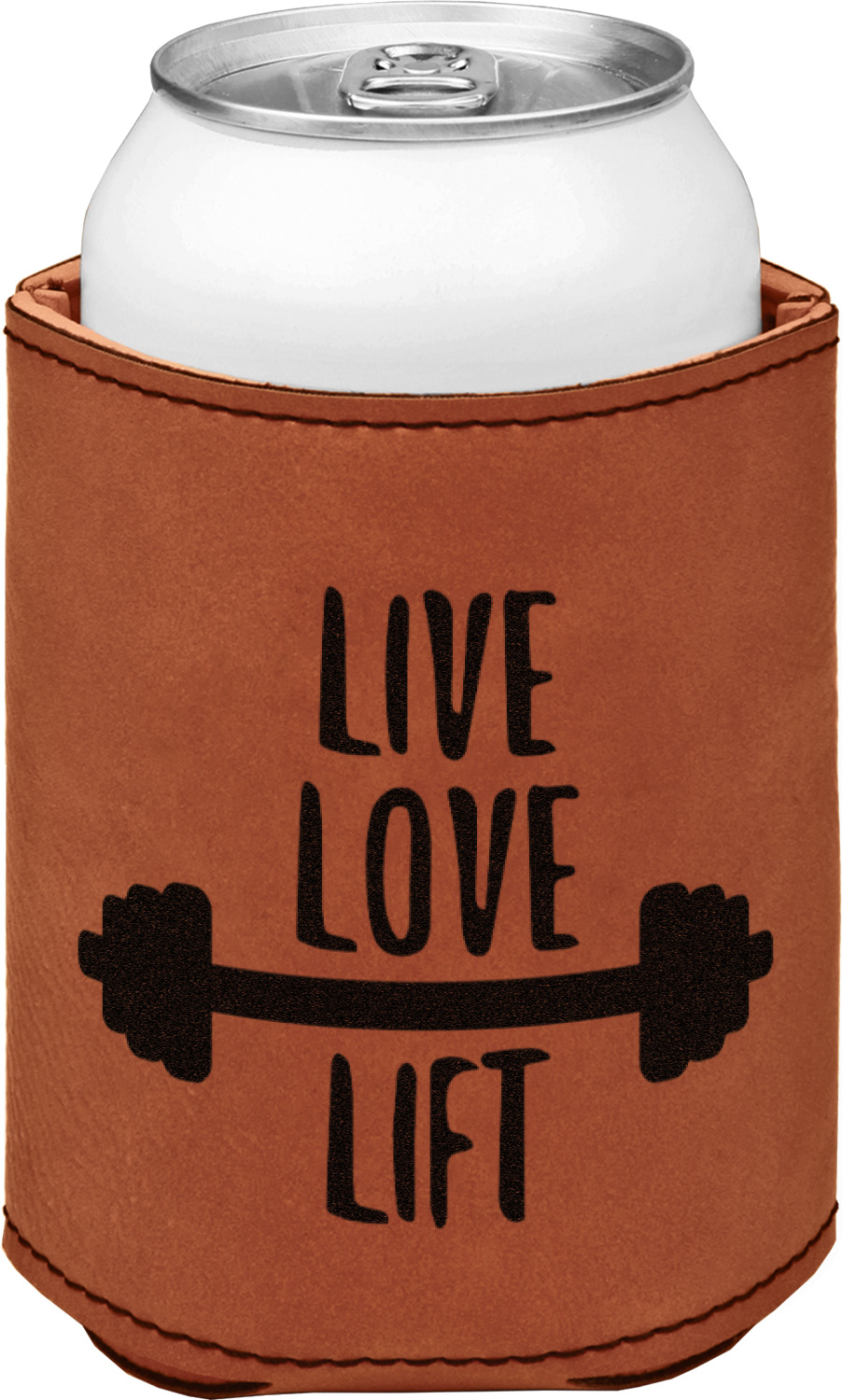 This can sleeve is made from a cognac-brown leatherette and stitched with a sturdy, black thread. A slim padding lines the inside of your can sleeve to allow for a better fit once your drink is inserted. The sleeve itself measures at 4 by 4.5 inches, allowing this custom can sleeve to accommodate most canned drinks. Your personalized design can be engraved on the front and back, or solely the front. When laser-engraved, your design appears as a black coloration which contrasts the leatherette nicely.