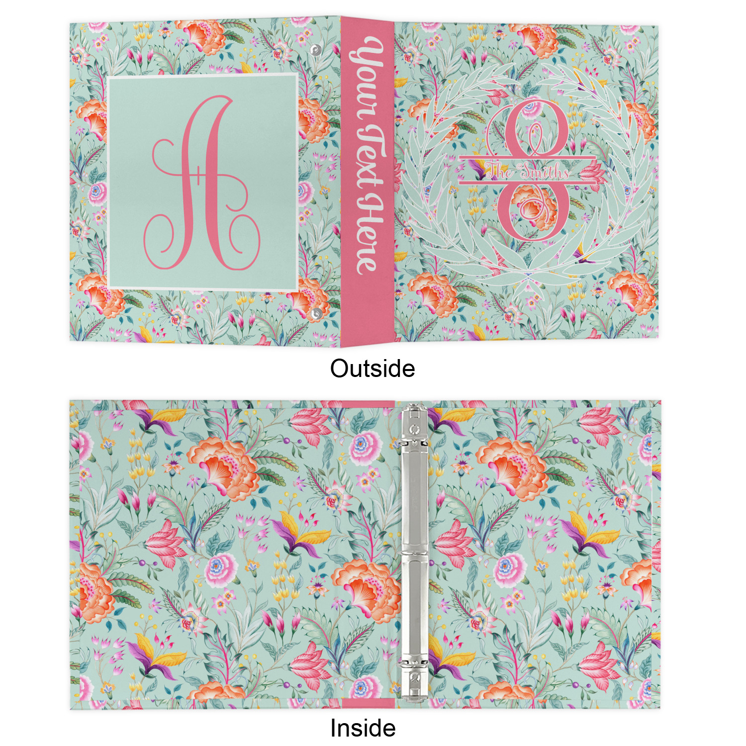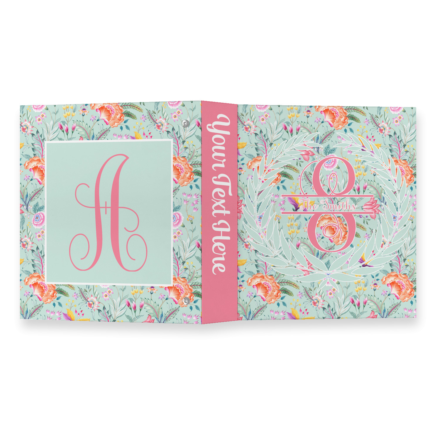 It features beautiful flowers and has a recolor-able background. We chose a light teal blue background to create a really soft & pretty design. We have featured a name & initial personalization in a leaf frame for the main design template.