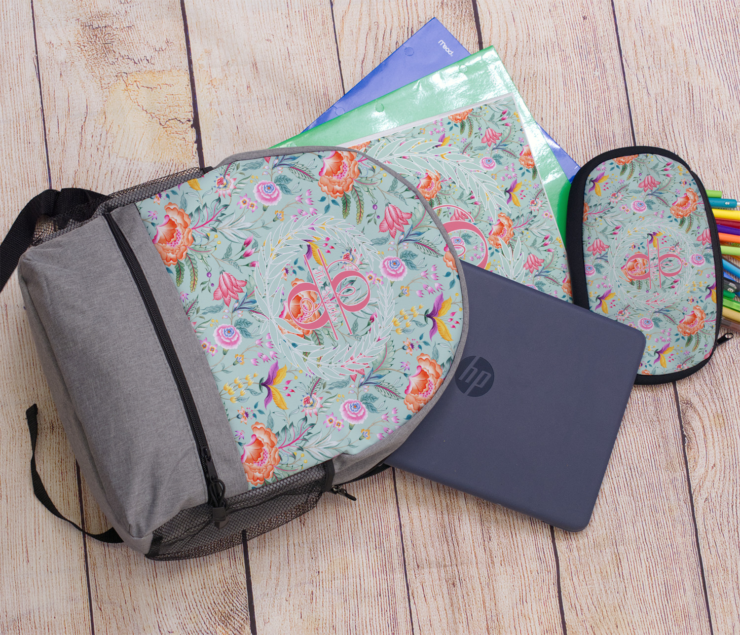It features beautiful flowers and has a recolor-able background. We chose a light teal blue background to create a really soft & pretty design. We have featured a name & initial personalization in a leaf frame for the main design template.