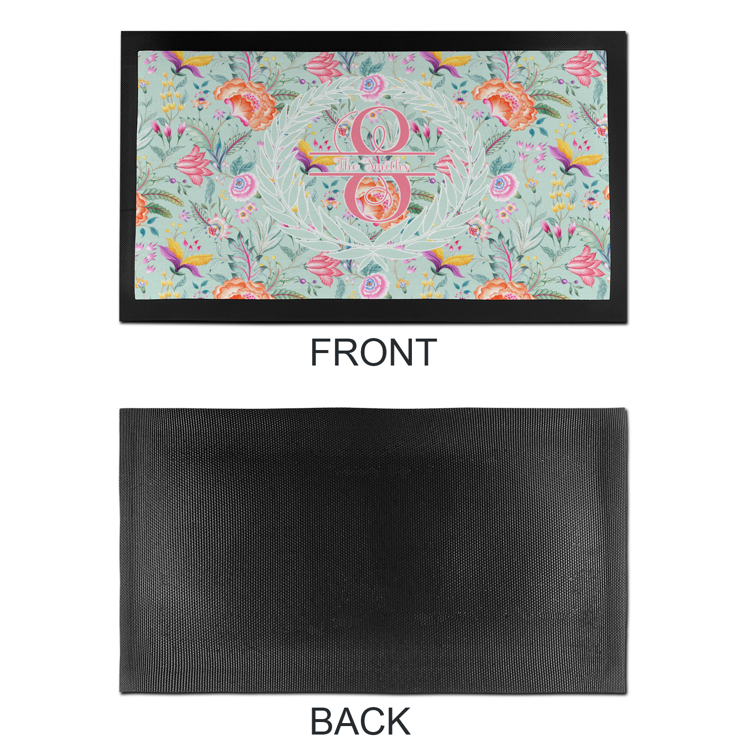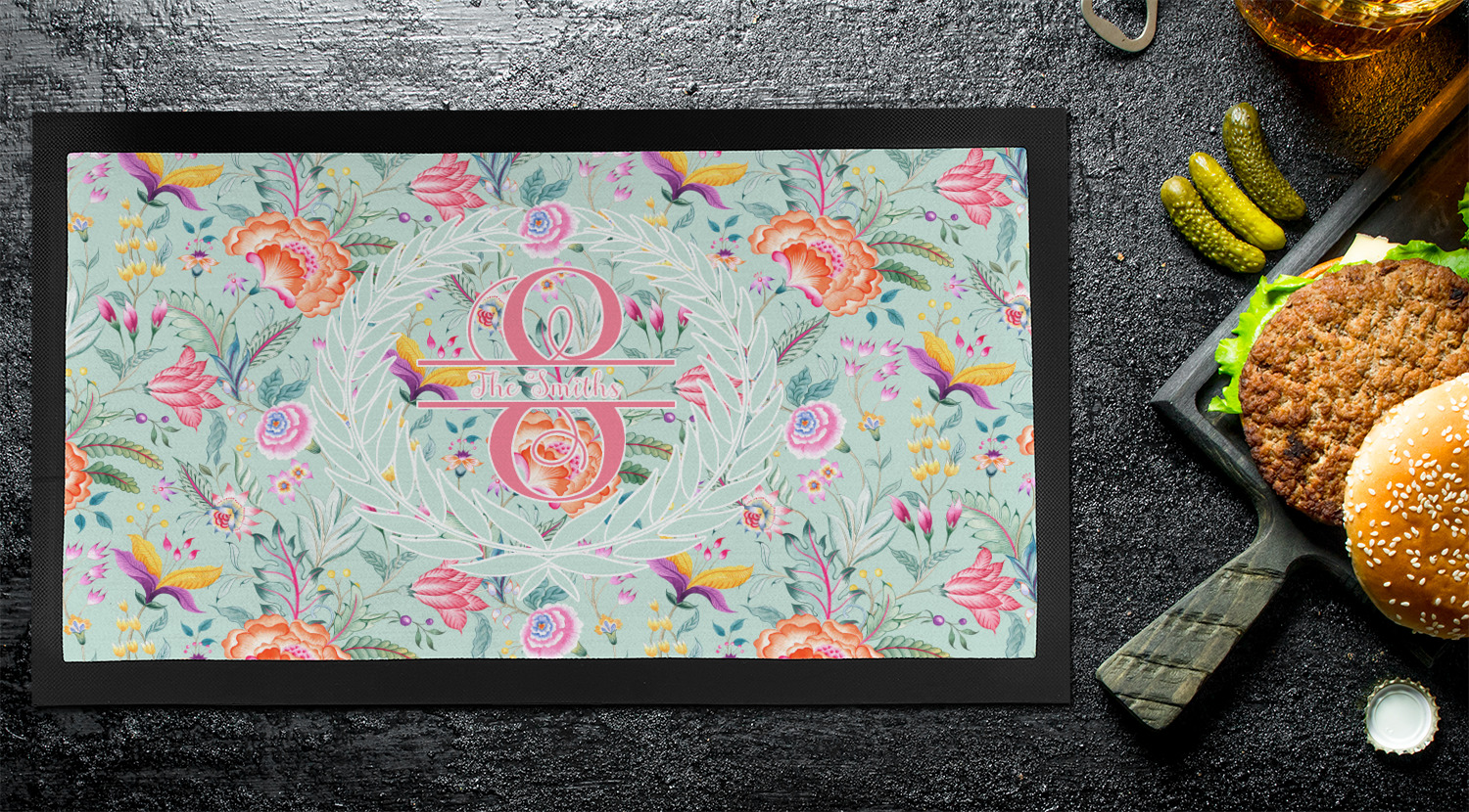 It features beautiful flowers and has a recolor-able background. We chose a light teal blue background to create a really soft & pretty design. We have featured a name & initial personalization in a leaf frame for the main design template.