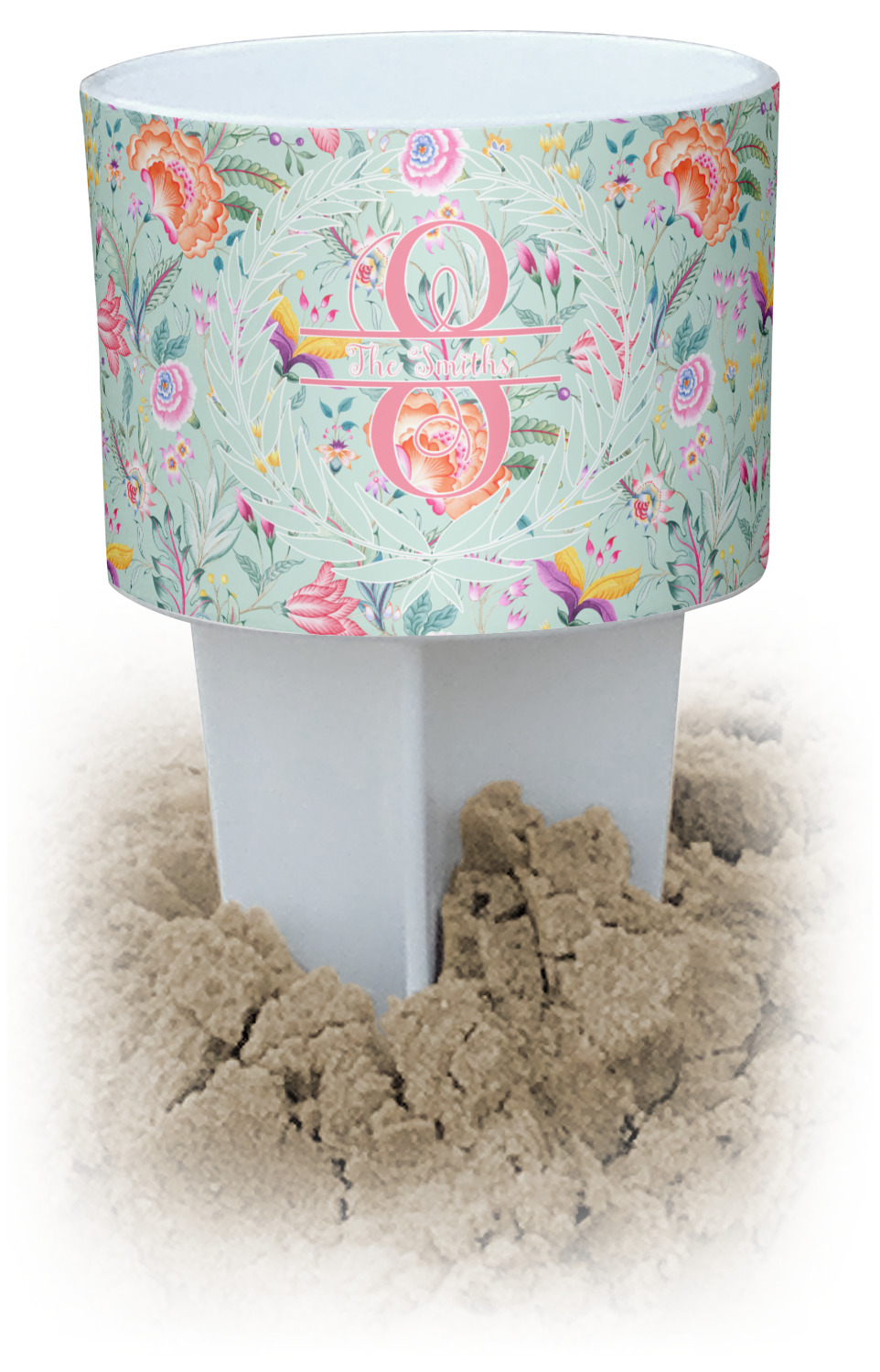 This cup holder has a large stake at its bottom that anchors it to the sand or ground below, while the cup holder rests above the stake. The entire drink holder is made of durable plastic and displays your customization around the cup holder portion. We sell these personalized beach spikers in two different colors: black and white.