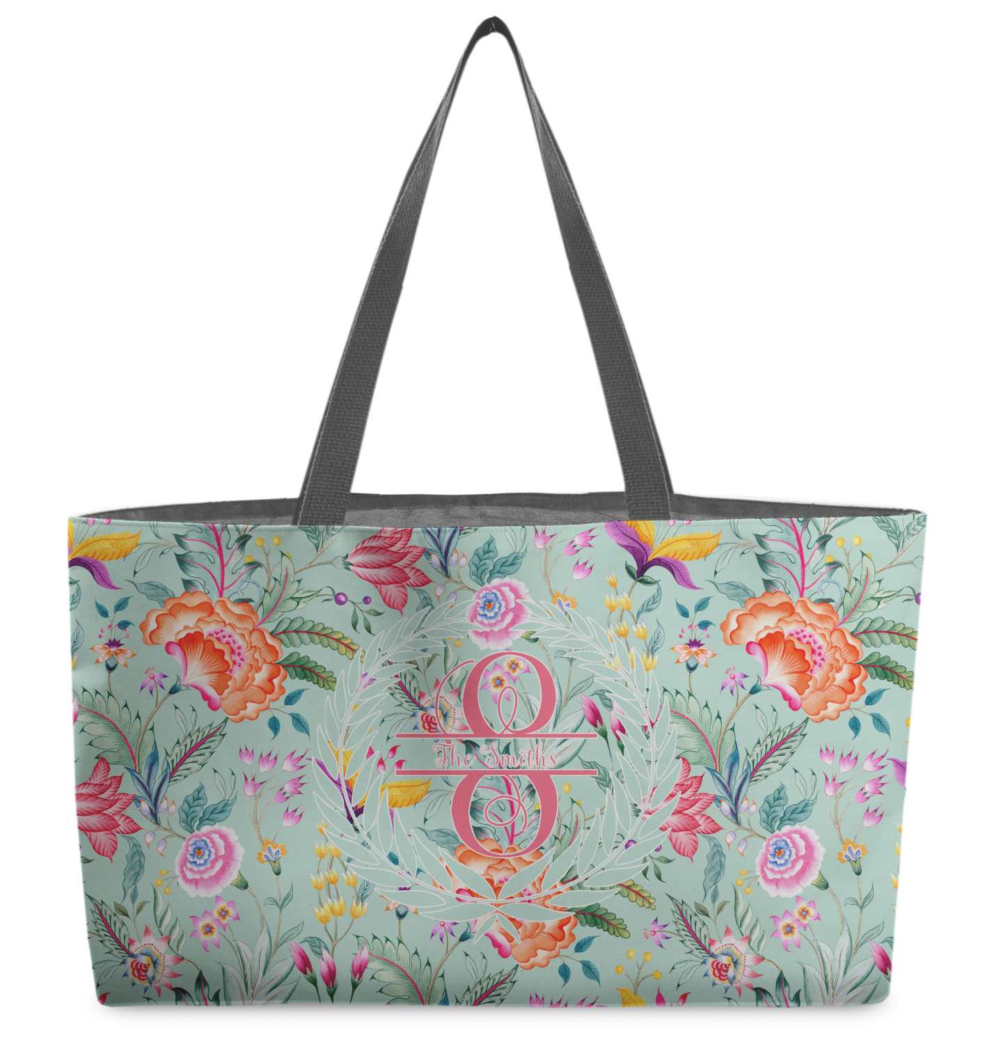 These beach totes are handmade here in the USA. Fabric is printed with your design. The tote is then sewn from the fabric pieces, lining and handles added.