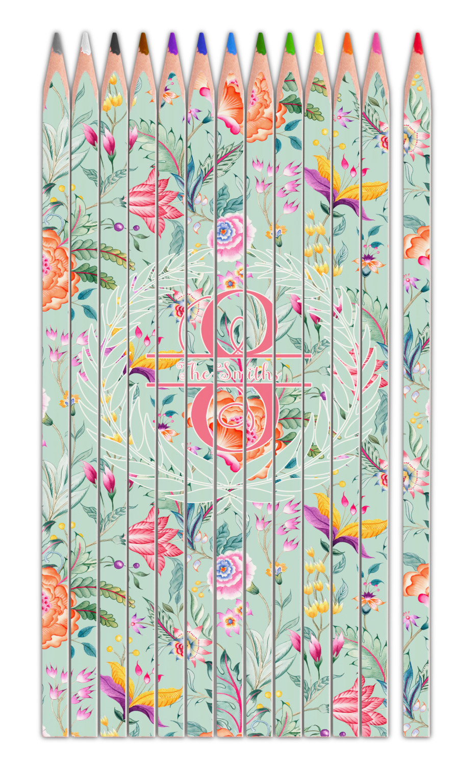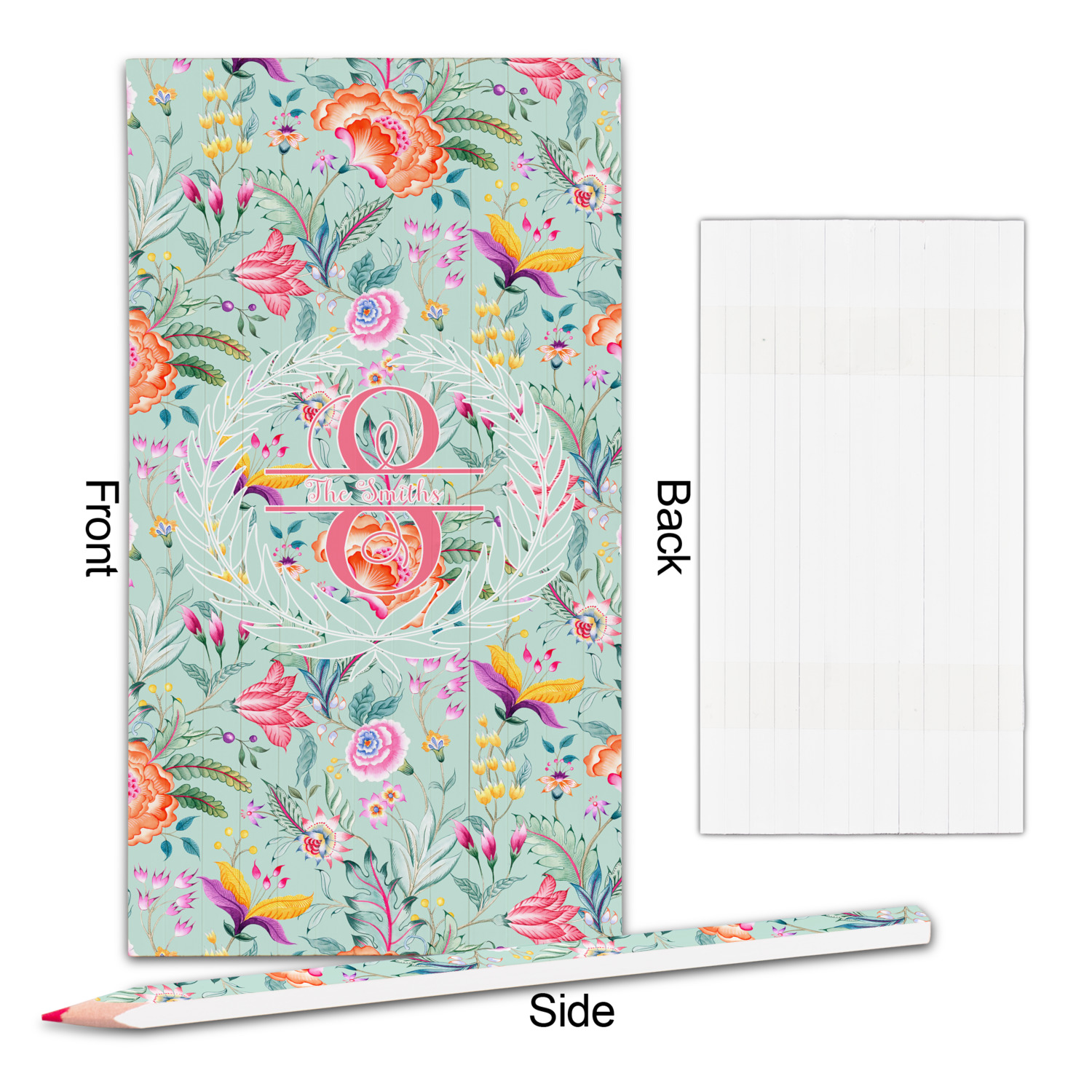 It features beautiful flowers and has a recolor-able background. We chose a light teal blue background to create a really soft & pretty design. We have featured a name & initial personalization in a leaf frame for the main design template.