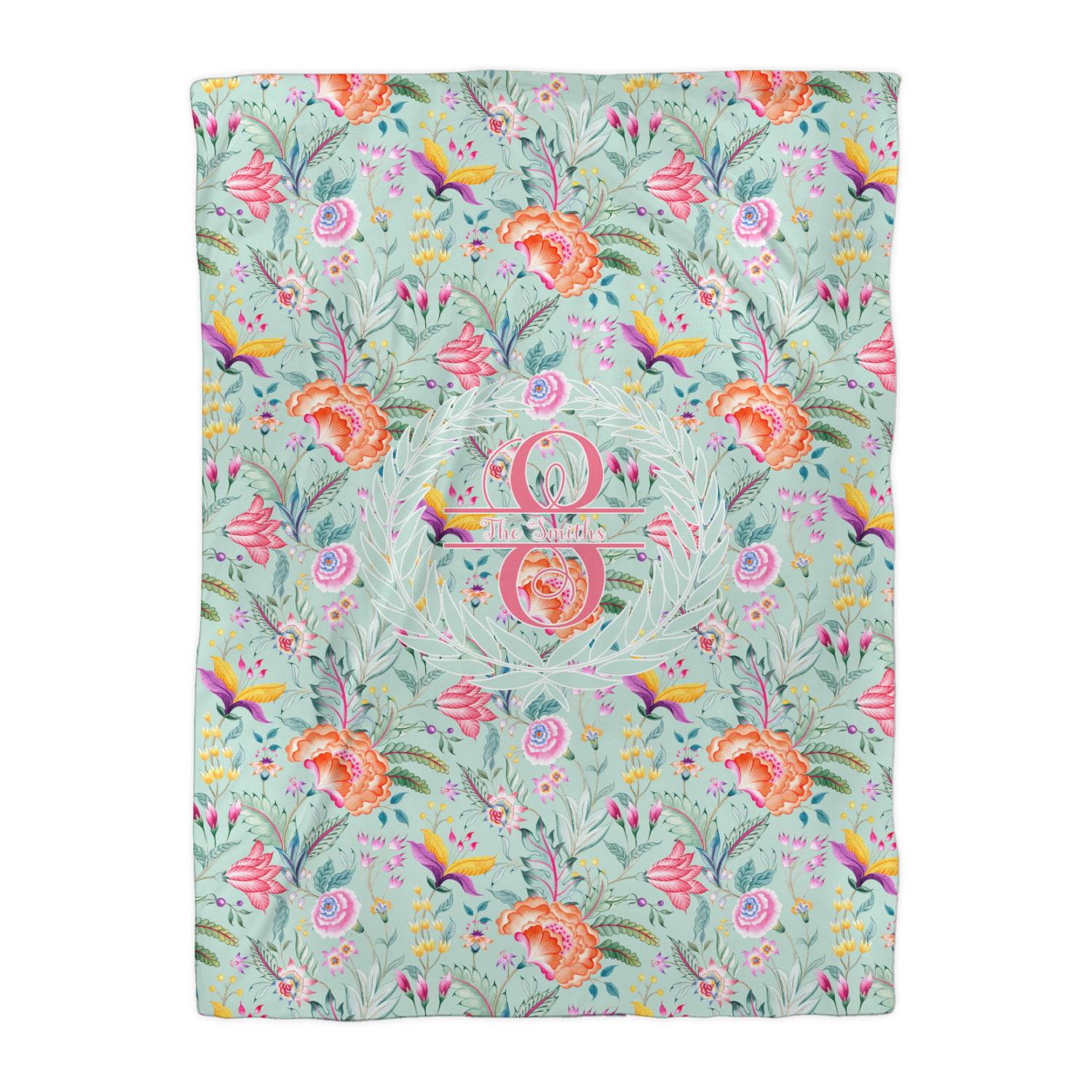 It features beautiful flowers and has a recolor-able background. We chose a light teal blue background to create a really soft & pretty design. We have featured a name & initial personalization in a leaf frame for the main design template.