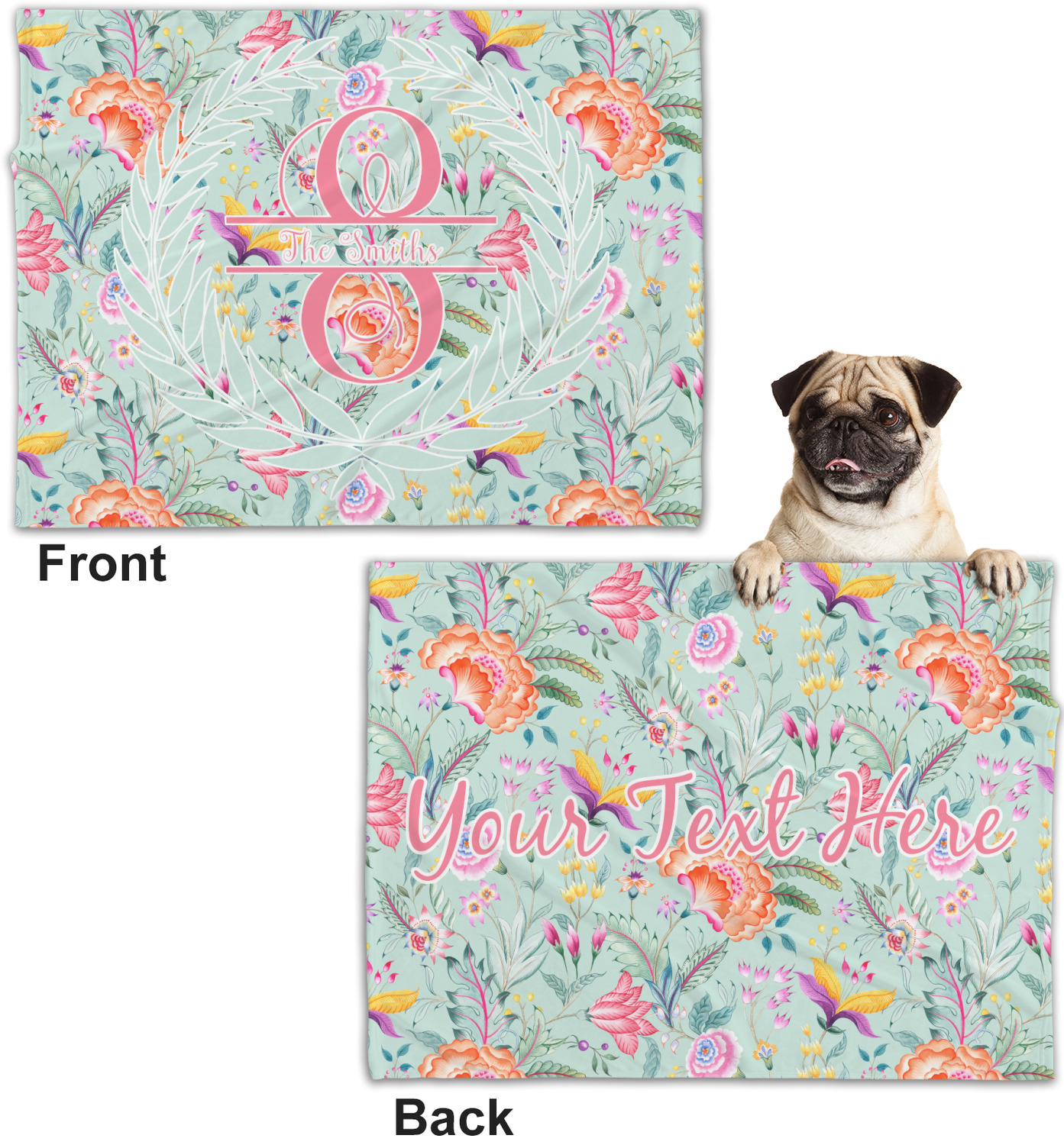 These dog blankets are crafted from a gentle, soft-to-the-touch, minky material. We print your customizations, either matching or differing, on both the top and underside of the blanket. These personalized dog blankets are available in two sizes: regular and large. Our regular size, at 40" x 30", accommodates small and some medium size dogs. At 60" x 50", our large dog blanket is a better fit for bigger breeds. Though specialized for dogs, these blankets still make a thoughtful gift for your favorite feline, or any other pet in mind!
