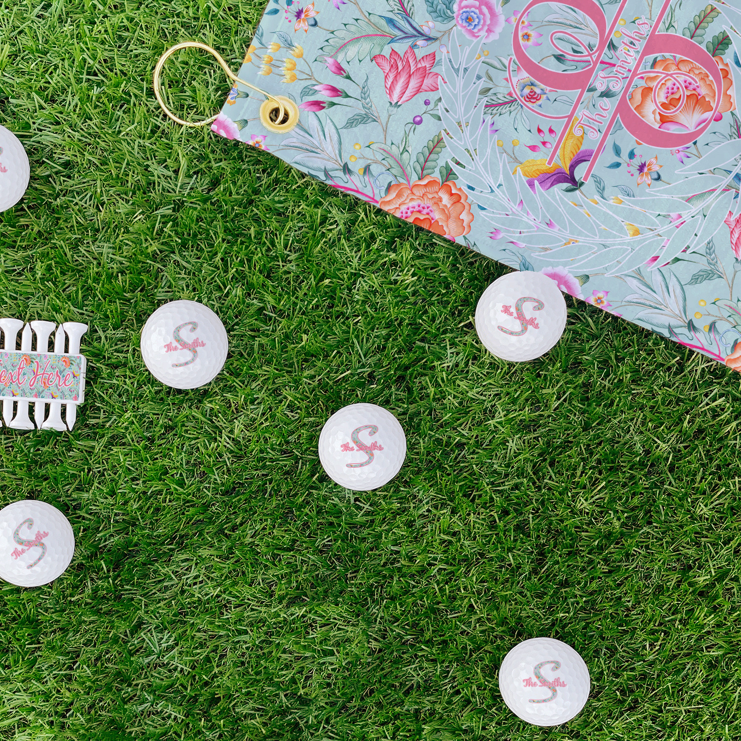 It features beautiful flowers and has a recolor-able background. We chose a light teal blue background to create a really soft & pretty design. We have featured a name & initial personalization in a leaf frame for the main design template.