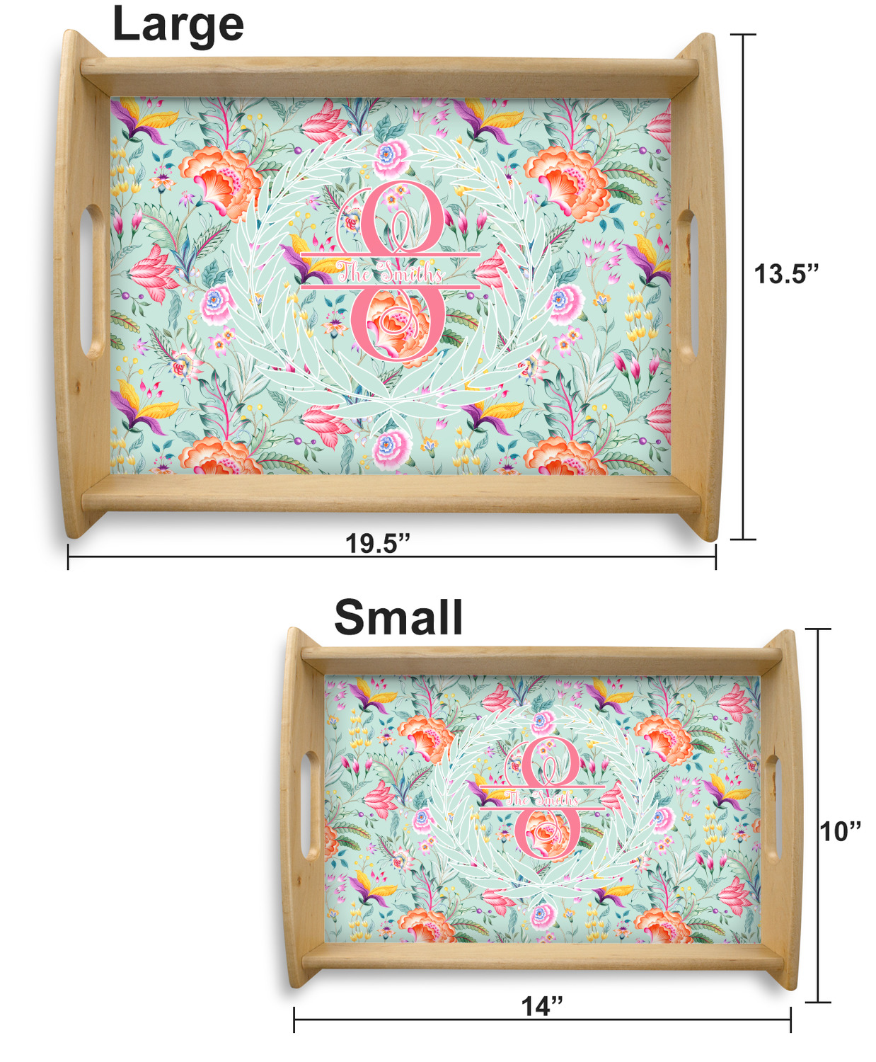 This serving tray with handles features square edges and two rounded sides, creating a very modern look. Each side is fabricated from a beautifully cut, natural wood. The bottom of the interior of the tray displays your customized design in bright, vibrant color. The tray is sold in both a black color and a natural wood look. Each variation of the wood serving tray has two sizes: Small, which is 14" x 10" x 2.25", and Large, which is 19.5" x 13.5" x 2.75".