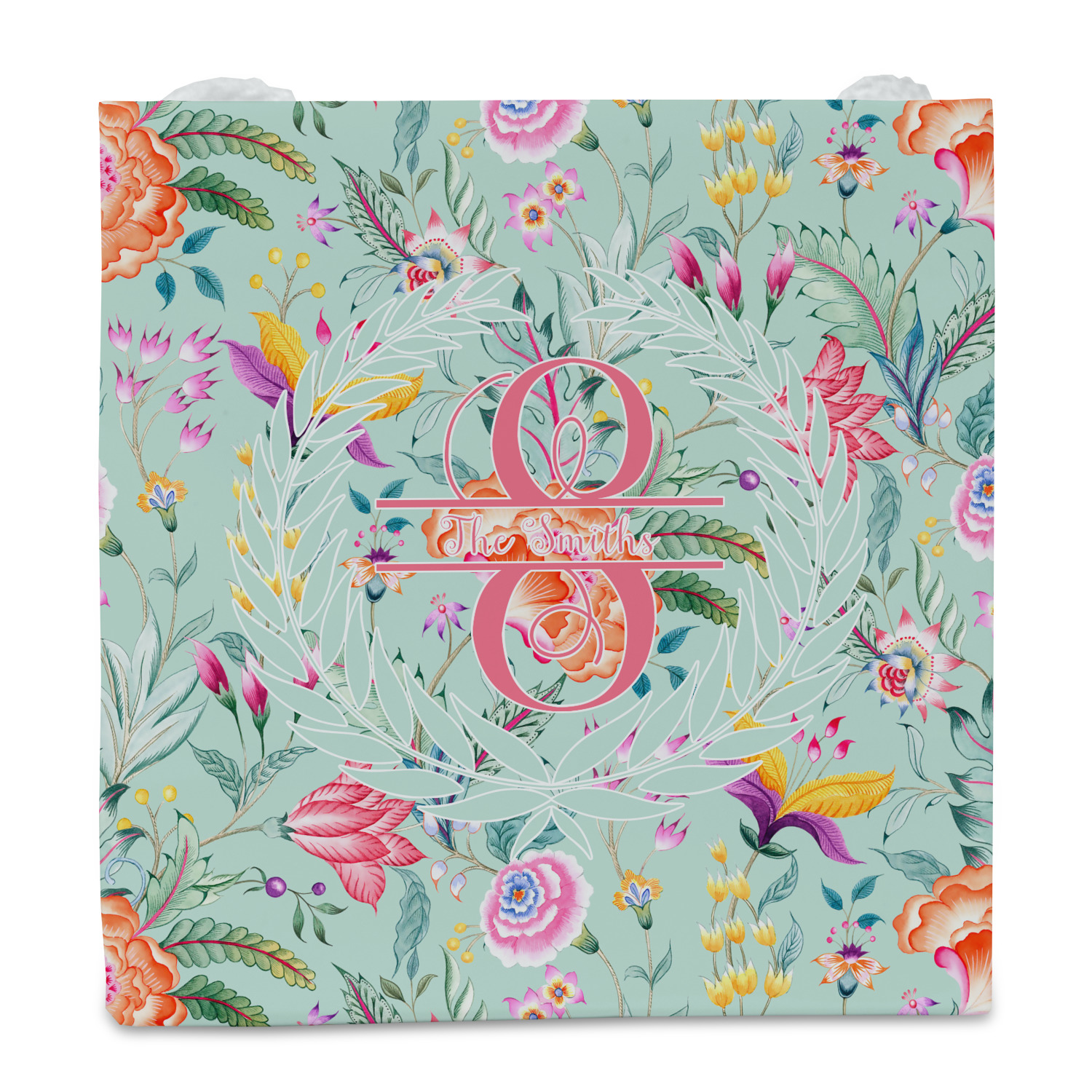It features beautiful flowers and has a recolor-able background. We chose a light teal blue background to create a really soft & pretty design. We have featured a name & initial personalization in a leaf frame for the main design template.