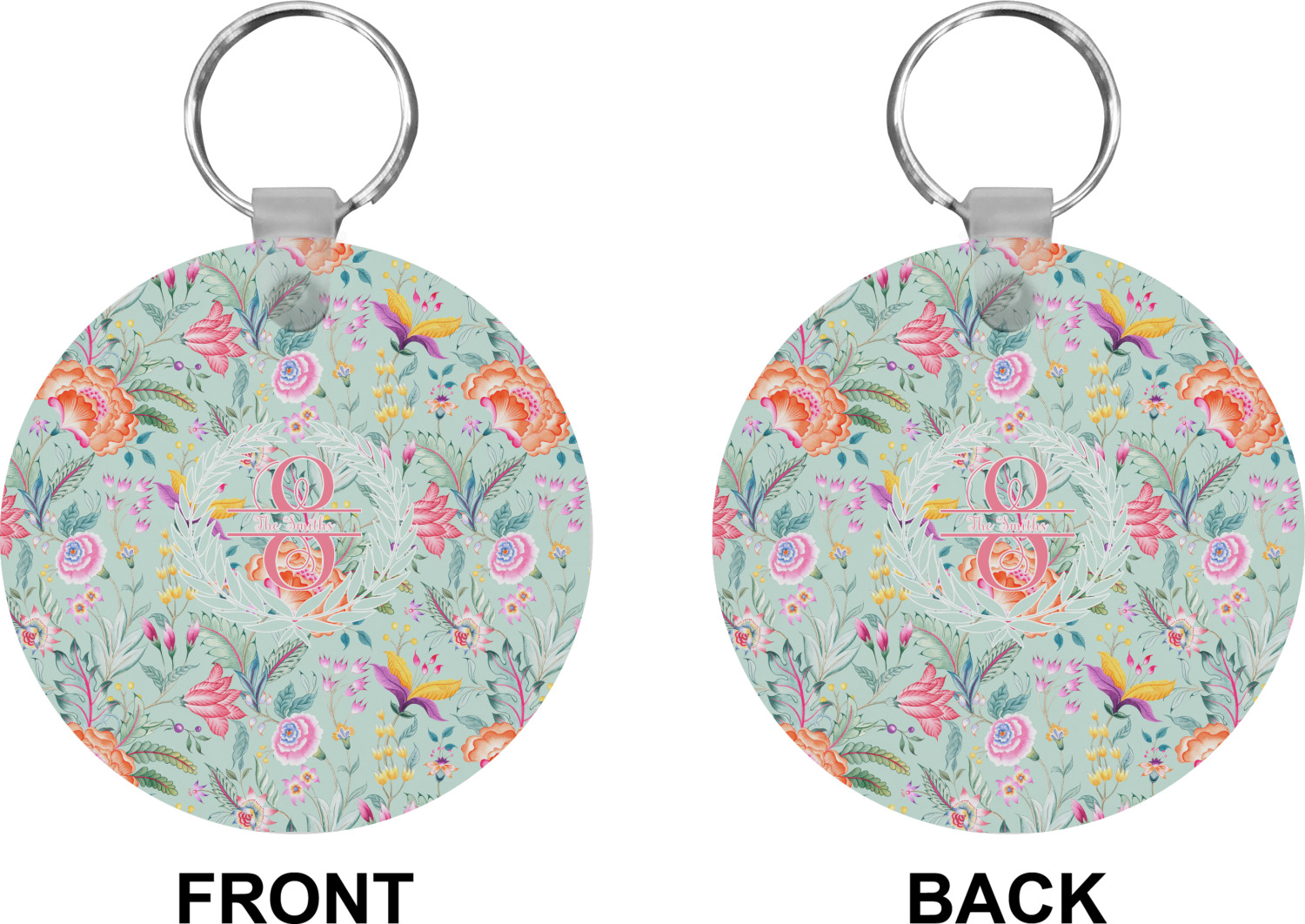 Our personalized keychains attach to the included metal, split key ring with a plastic, removable snap. Since a metal ring is included with your purchase, you have the liberty to keep your keys together on the ring, with or without your unique keychain. We offer this keychain in three different shapes: circle, heart, or diamond. We print your personalized design(s) on both sides of the key chain, and the surface has a glossy, reflective finish that only emphasizes your design. Each keychain is approximately 2.25 by 2.25 inches.