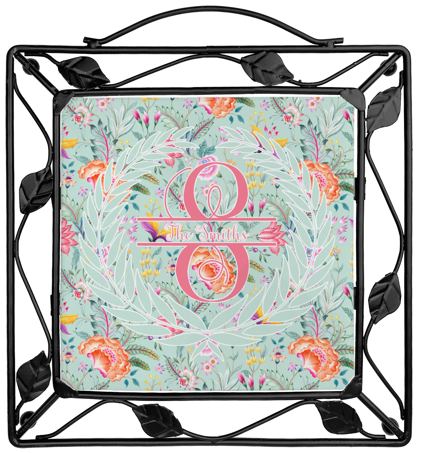 Our square trivets are made from a durable, wrought iron. This model features 4 small half circles, one on each corner, and a larger ring of iron that circles the central, customized tile. Each of the 4 corners has a round foot on its bottom for stability. This trivet is 8.75 by 8.75 inches, but the central tile measures at 6 inches on both sides.