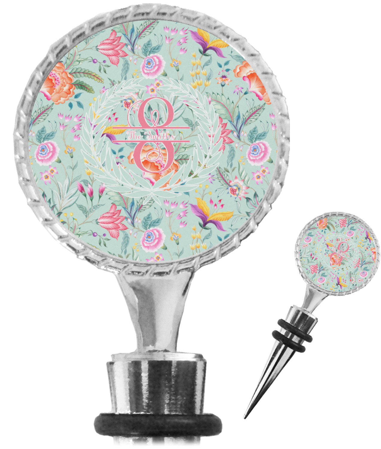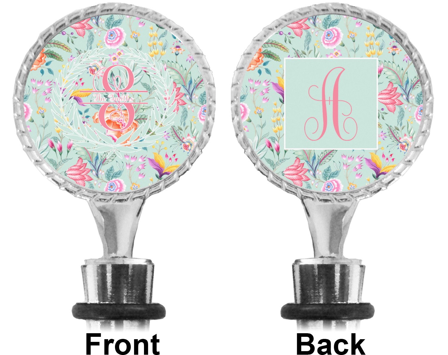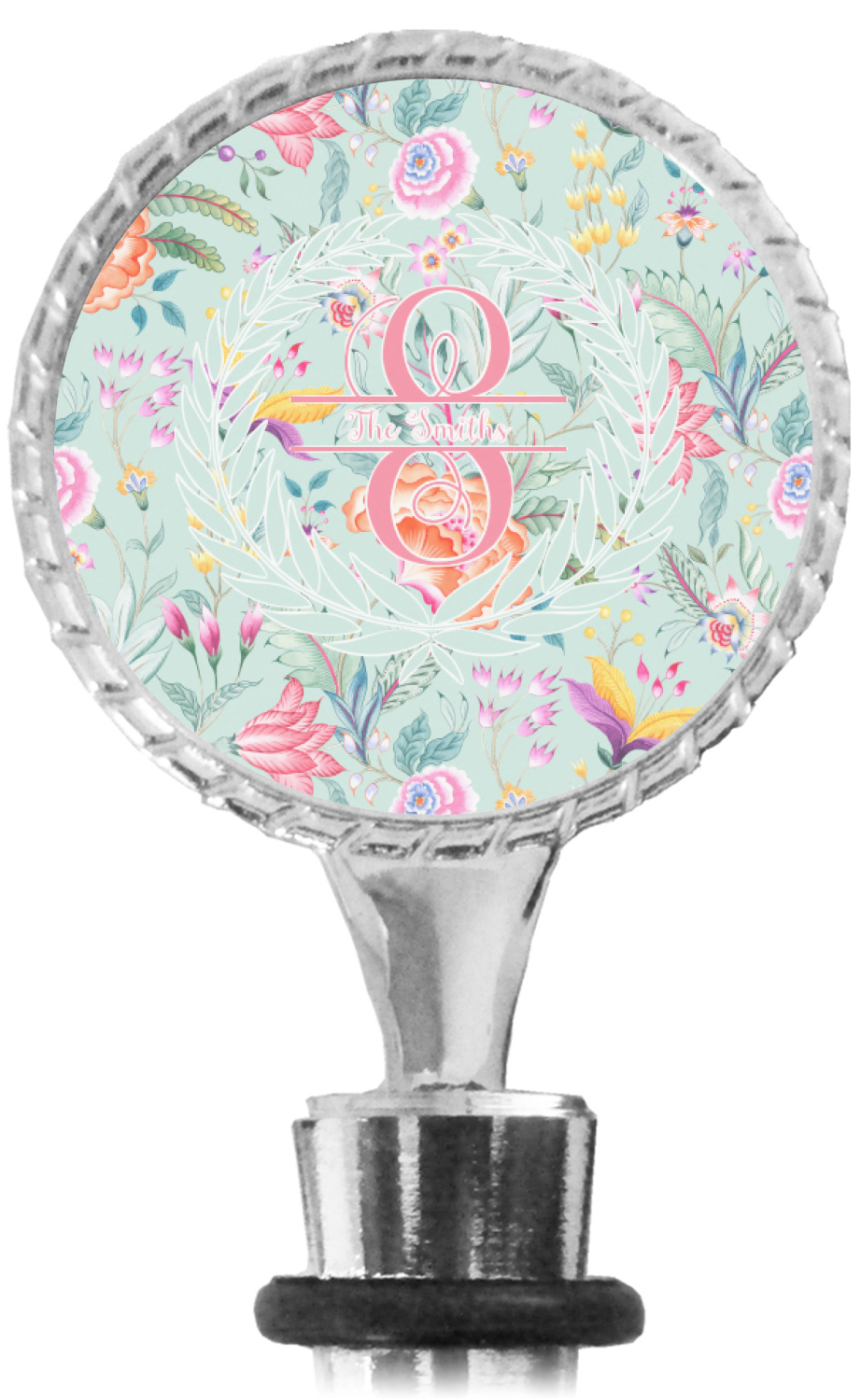 The top part of your bottle stopper is comprised of a zinc ring that displays your customization(s) in its middle, on both sides. The ring is heavy duty, with a bright chrome finish. The body of the wine stoppers have two silicone rings to provide an airtight seal. These wine bottle stoppers measure at 1.625" L x 0.8125" W x 4.625" H; your custom wine stopper is meant to fit into most standard-sized wine bottles.