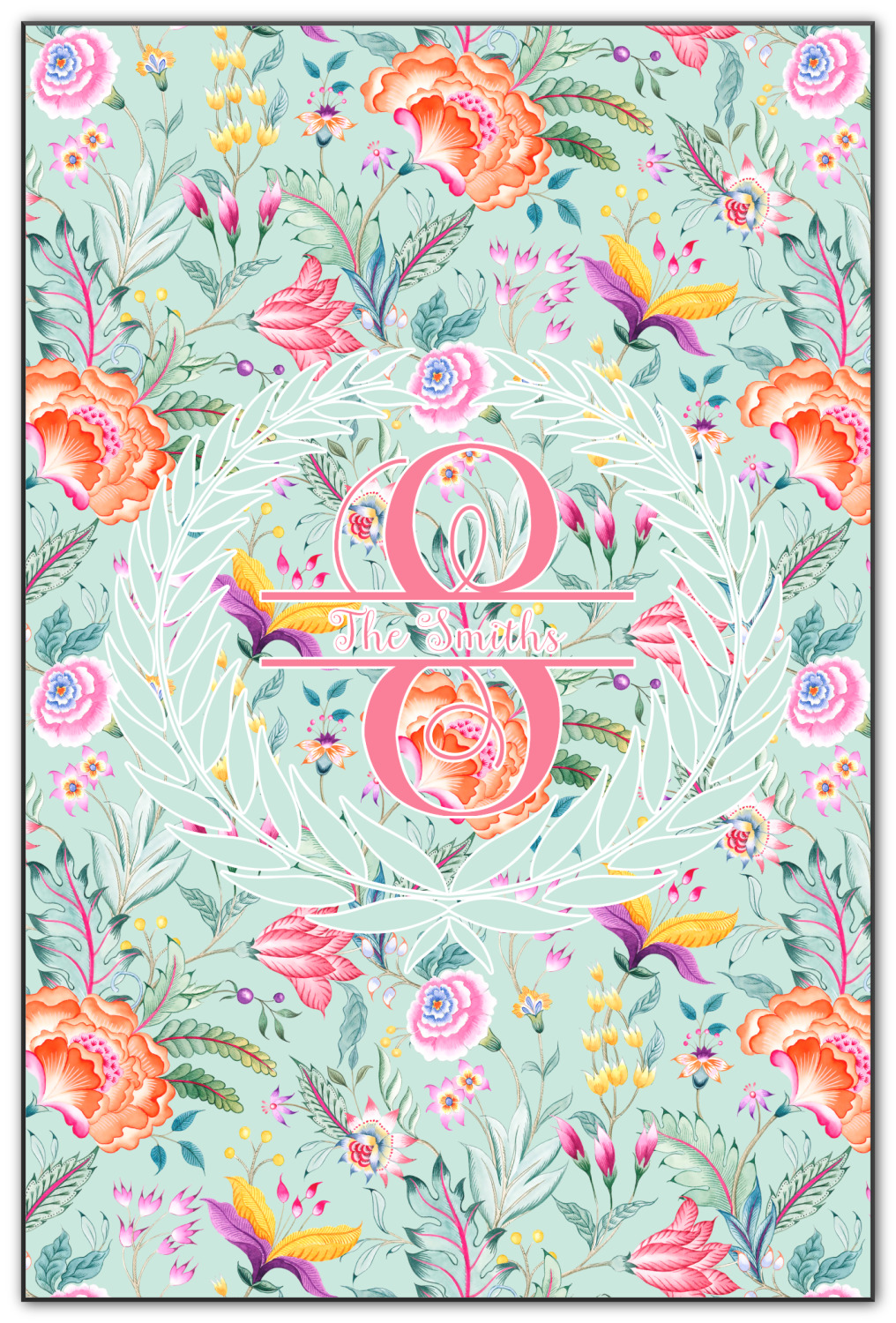 It features beautiful flowers and has a recolor-able background. We chose a light teal blue background to create a really soft & pretty design. We have featured a name & initial personalization in a leaf frame for the main design template.