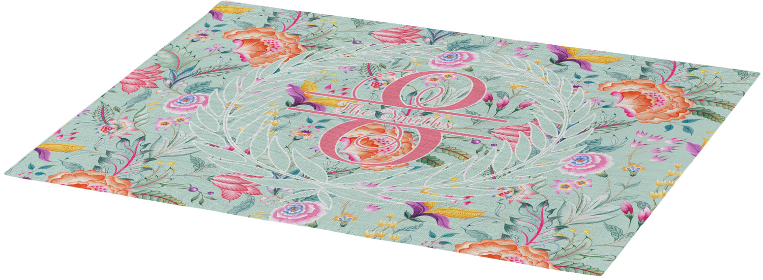 Each of our table mats are a poly twill material with woven burlap detailing. This creates a soft, quality placemat for us to fully print your personalized design across. The woven twill also adds a wrinkle-free surface to set your table! Each customizable placemat is a rectangle shape measuring at approximately 13 x 18 and printed here in the USA.