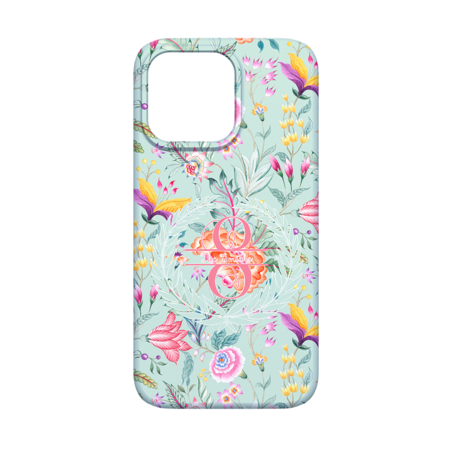 It features beautiful flowers and has a recolor-able background. We chose a light teal blue background to create a really soft & pretty design. We have featured a name & initial personalization in a leaf frame for the main design template.